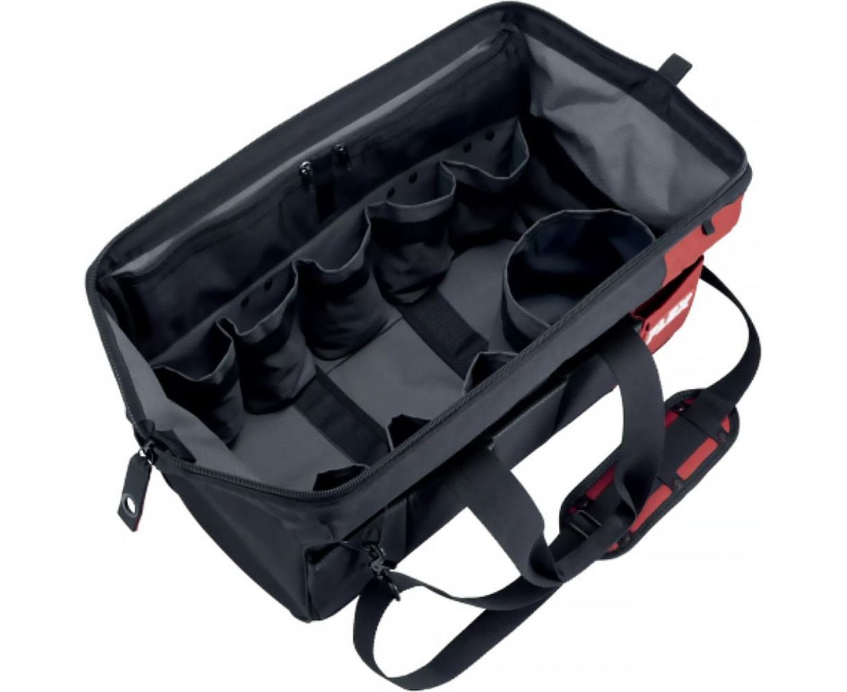 Для удобства предусмотрен мягкий наплечный ремень и усиленные сталью ручки. С большим пространством для хранения до трех инструментов, а также отделениями для аксессуаров, таких как батарейки, зарядное устройство и т.д., и пятью внешними карманами спереди. Оснащен резиновыми ножками, запирающейся застежкой-молнией, мягким ремнем для переноски и ручками, усиленными сталью.