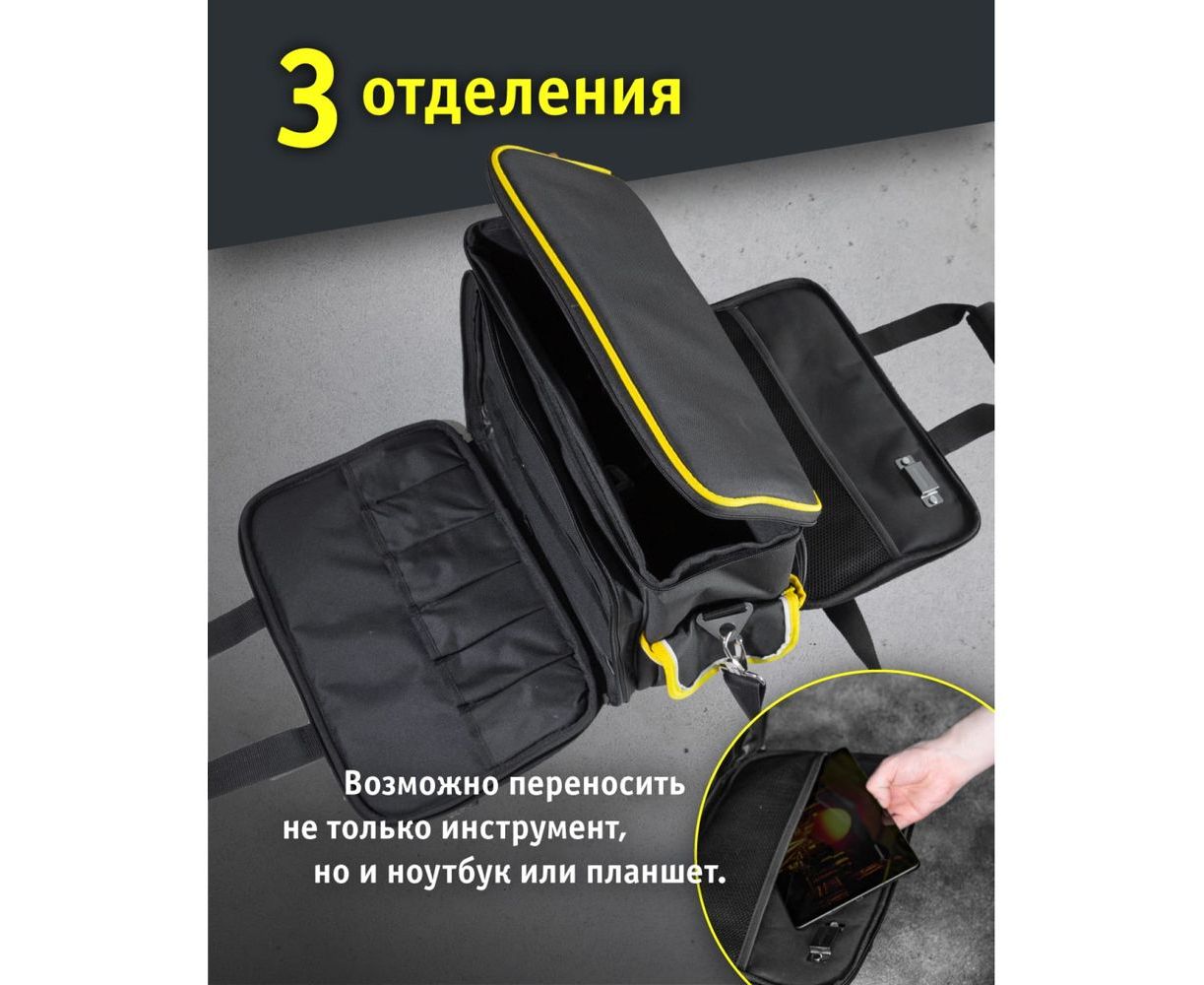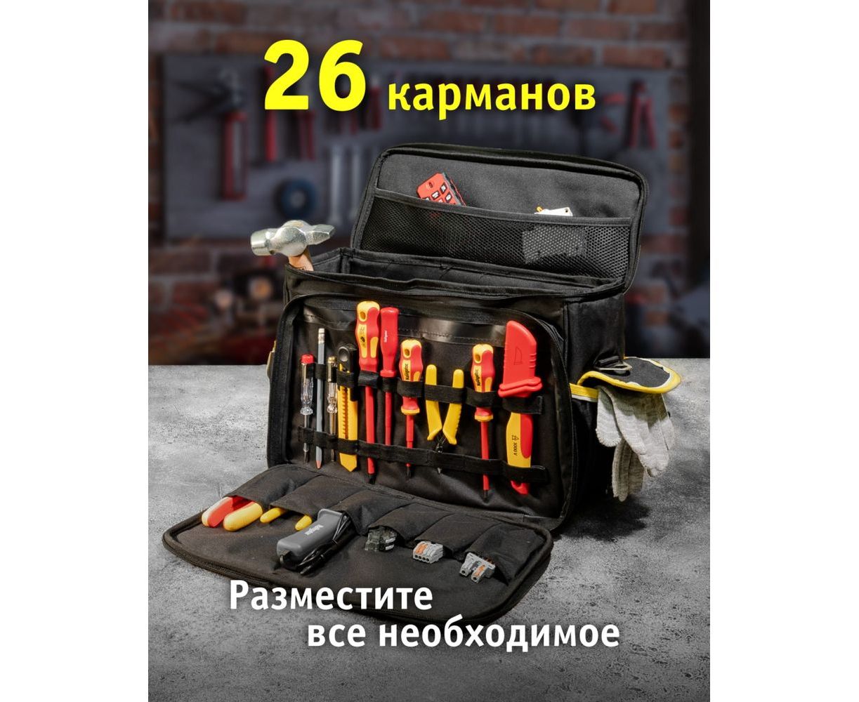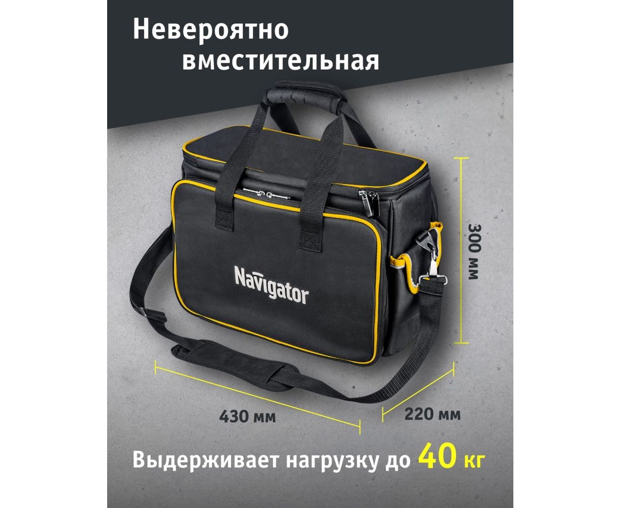 Строительная сумка NavigatorNTA-Bag06 имеет прямоугольную форму, и выполнена в виде портфеля с одним большим и двумя малыми отделениями, что делает ее идеальной удобной для переноскии хранения не только инструмента, строительных принадлежностей и средств индивидуальной защиты, но и для ноутбука, планшета и бумажной документации. Размер сумки 450х270х230 мм. Сумка для инструментов электрикавыполнена из износостойкого водоотталкивающего материала Oxford 600D с ПВХ-пропиткой. Дно сумки укреплено и защищено мягкой прокладкой, швы надежно прошиты, а на основании распложены 4 резиновые «ножки», которые защищают сумку от влаги, грязи и износа. В сумке 26 карманов и секций, которые позволяют аккуратно разместить все необходимые инструменты и аксессуары. На ручках строительной сумки NavigatorNTA-Bag06предусмотрен мягкий холдер на «липучке» для комфортного ношения. Сумка укомплектована регулируемым ремнем с мягким наплечником, который обеспечивает равномерное распределение нагрузки в процессе ношения. Максимальная нагрузка сумки монтажника – 40 кг.
