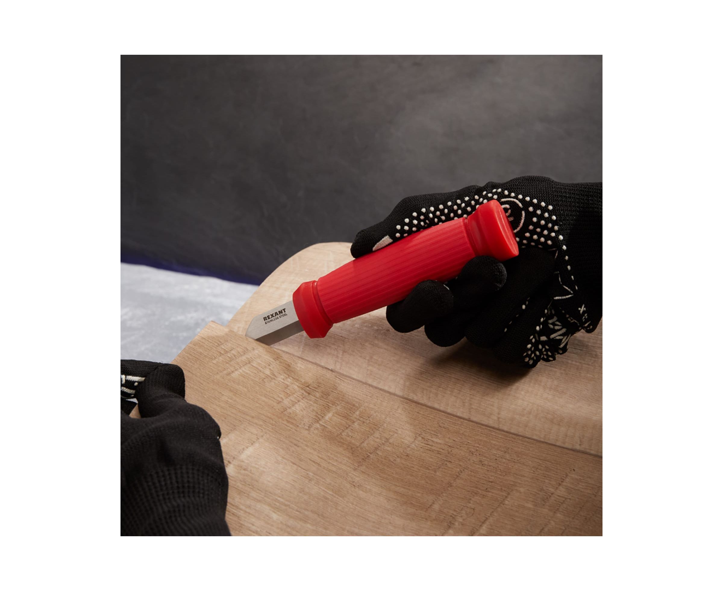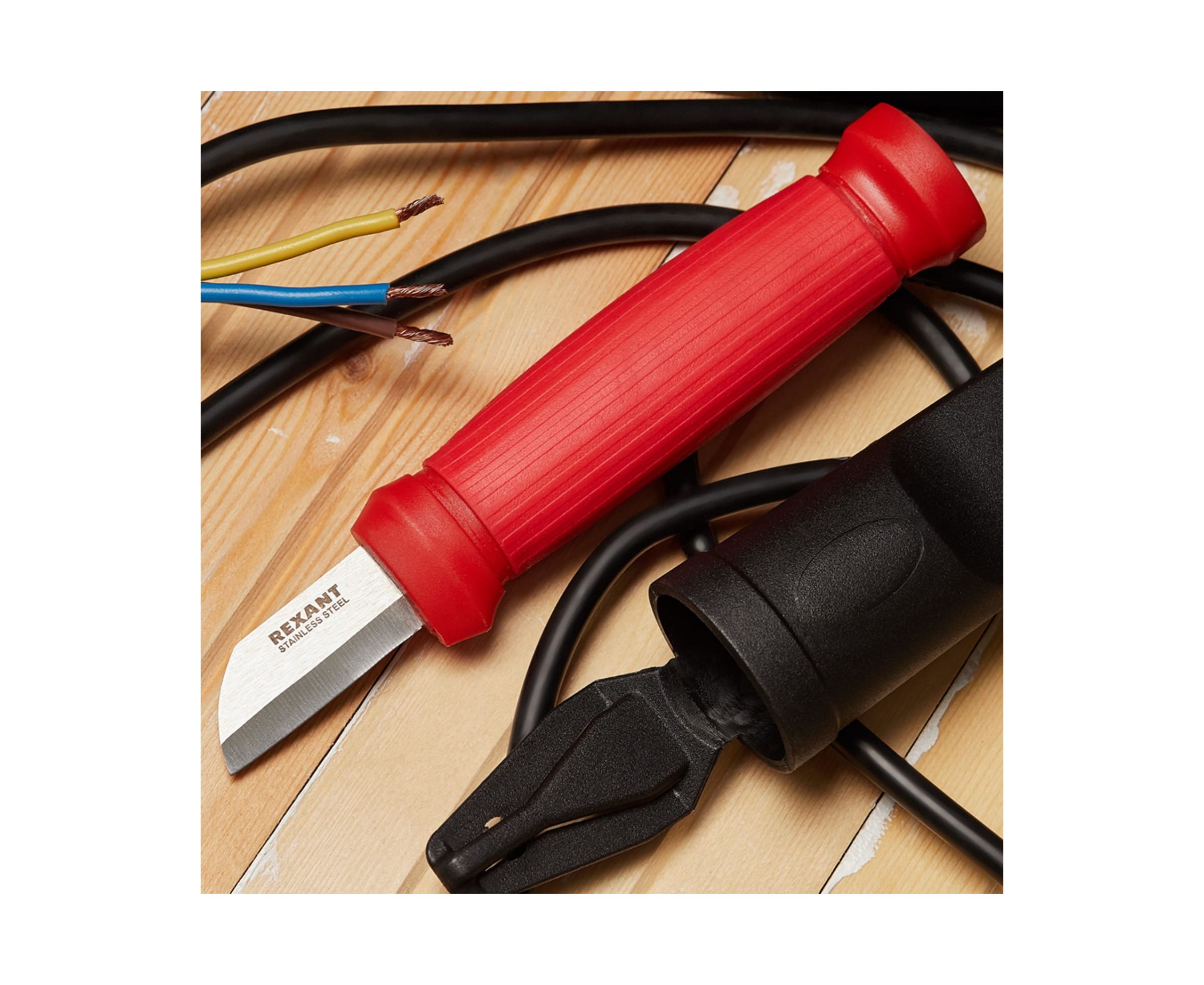 Нож монтажника REXANT нержавеющая сталь, лезвие 42 мм 12-4932 используется для удаления изоляции с кабелей, а также для выполнения других монтажных и демонтажных работ. Инструмент позволяет снимать оболочку без риска повреждения жильной изоляции.