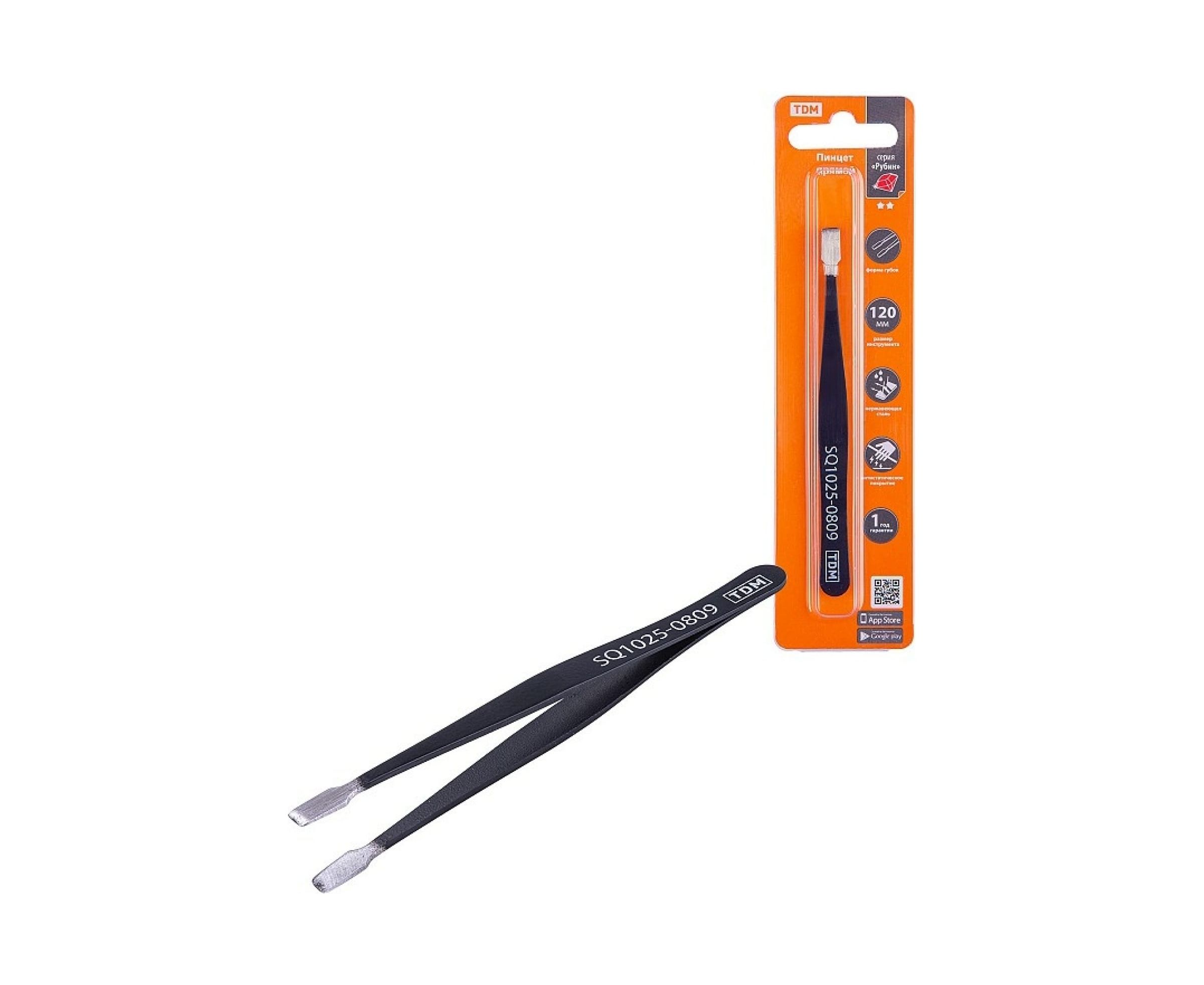 Пинцет TDM прямой 120 мм, плоское жало 5 мм, нерж., антистатич. покр., блистер, Рубин SQ1025-0809 имеет небольшие размеры и плоские губки, что позволяет работать с мелкими деталями.