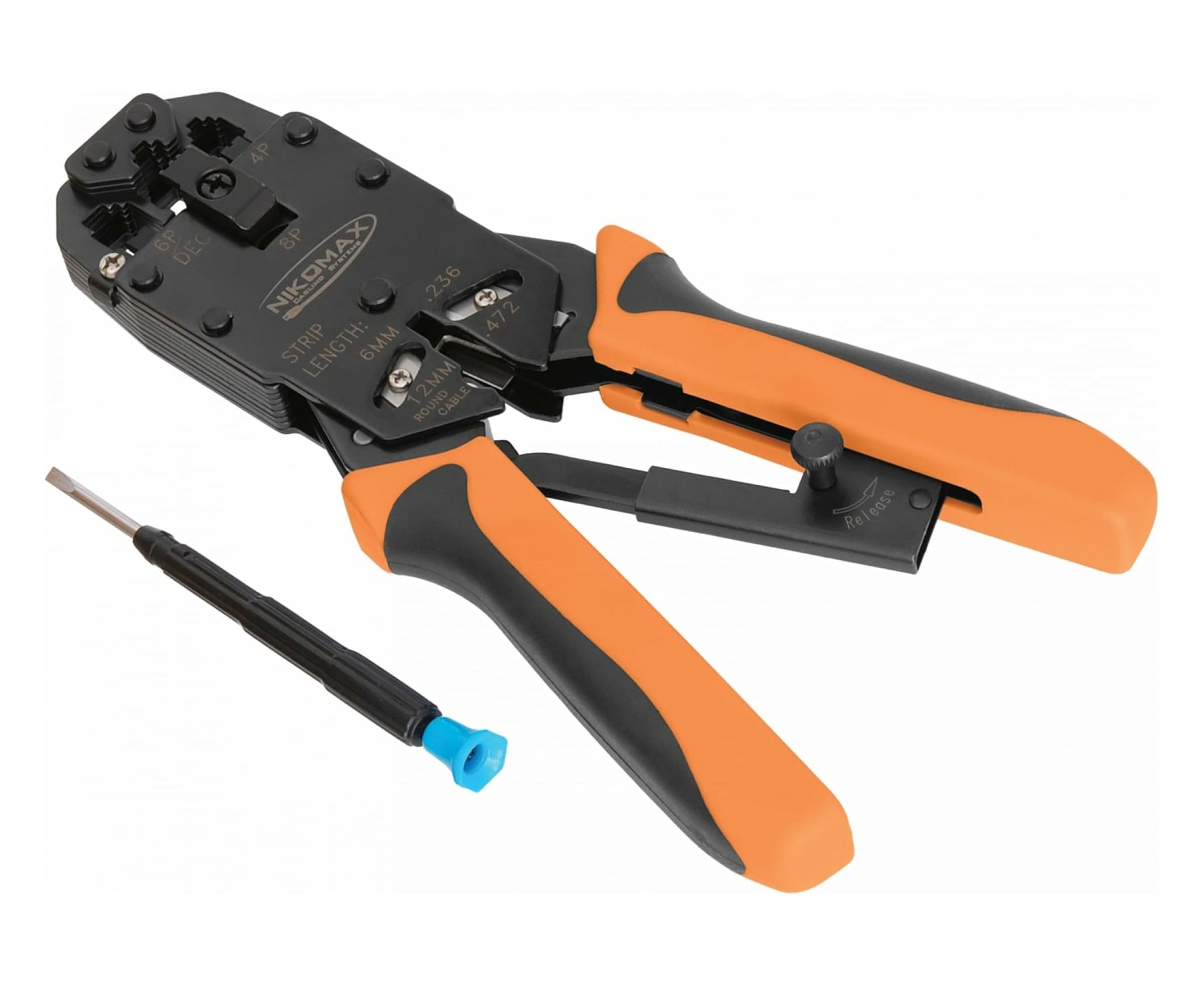 Ручной обжимной профессиональный инструмент NIKOMAX 3 гнезда, торцевой, с храповиком NMC-2008AR (кримпер) используется для обжима коннекторов на телефонных кабелях и на кабелях передачи данных.