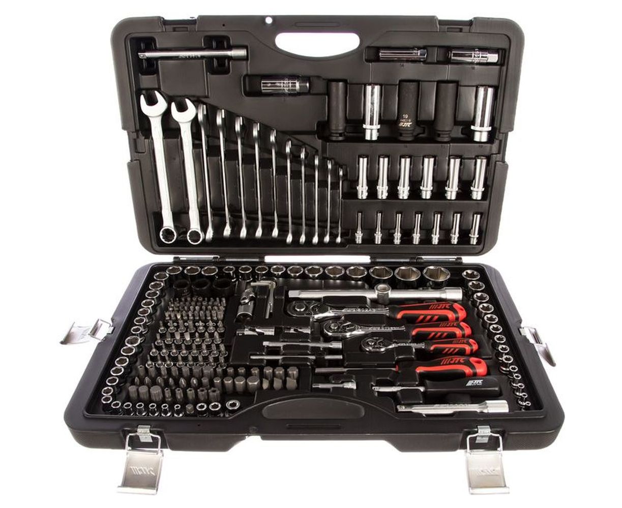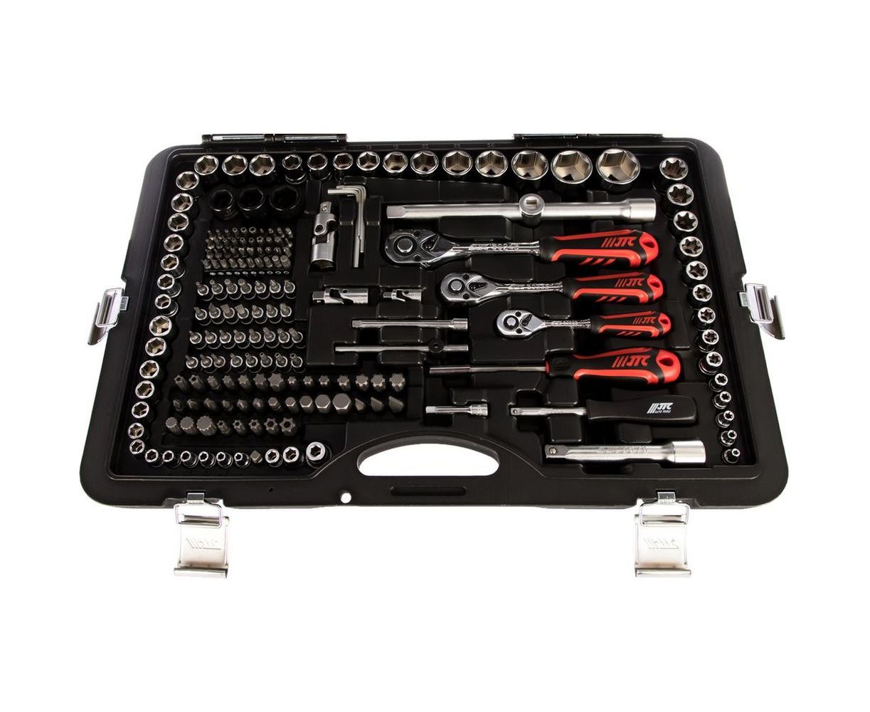 Набор инструментов 216 предметов JTC H216C-B72 охватывает большинство типовых размеров крепежа и позволяет работать с различным усилием за счет трех трещоток и большого количества переходников. Комплект инструмента подойдет для автомобилистов.