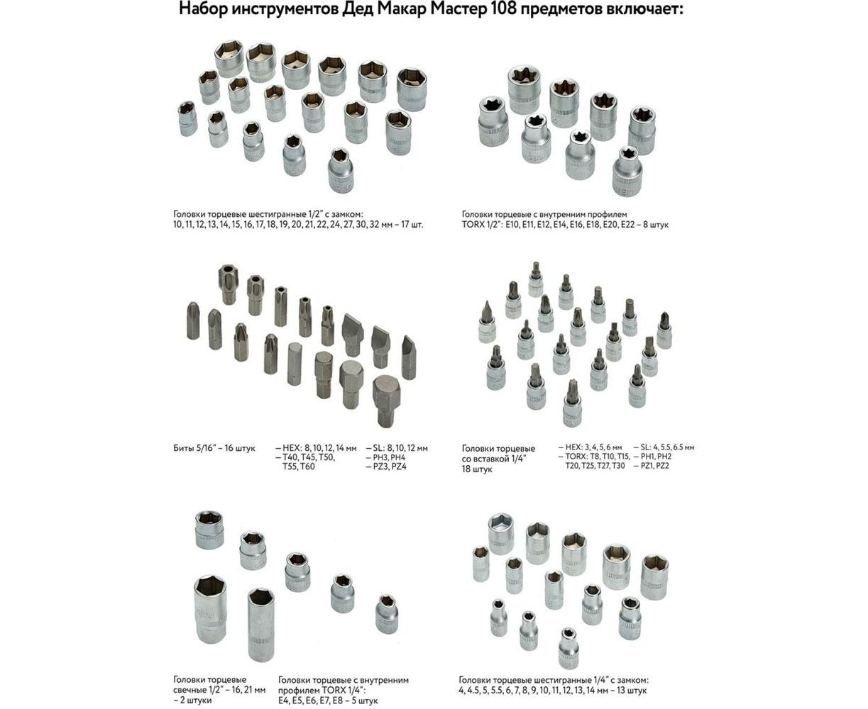 Набор инструментов Дед Макар Мастер 108 предметов МР-108 3 00-00015132 состоит из 108 предметов, представляет собой универсальный набор с широкой применяемостью. Рабочие части инструмента изготовлены из высококачественной хром-ванадиевой стали, которая выдерживает высокие нагрузки и защищена от коррозии. Эргономичные ручки с противоскользящим покрытием удобно лежат в руке и обеспечивают надежный захват инструмента. В комплекте удобный пластиковый кейс для переноски и хранения инструмента.
