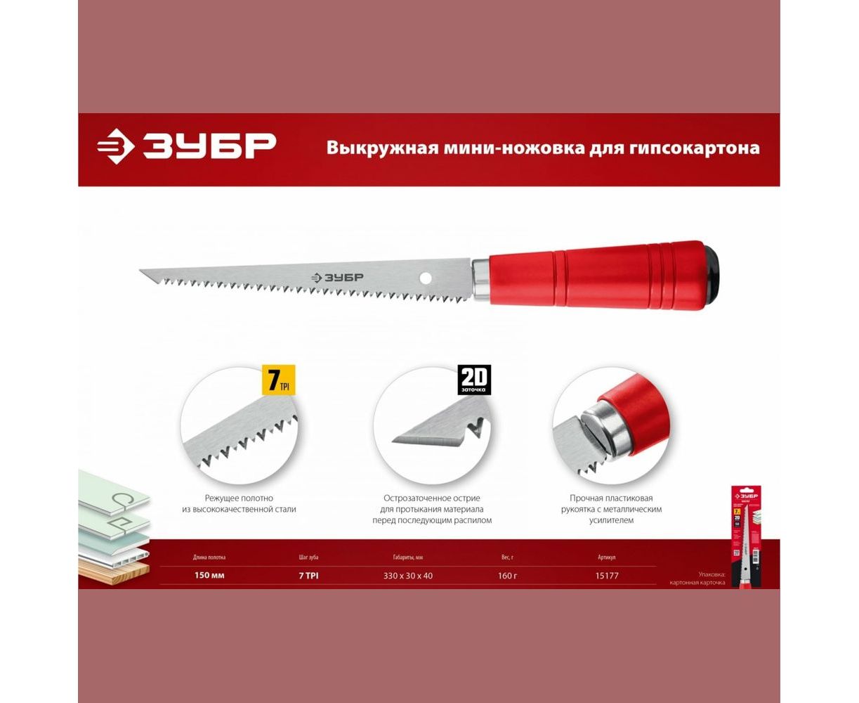 Выкружная мини-ножовка для гипсокартона ЗУБР 150 мм 15177 используется для строительных работ.