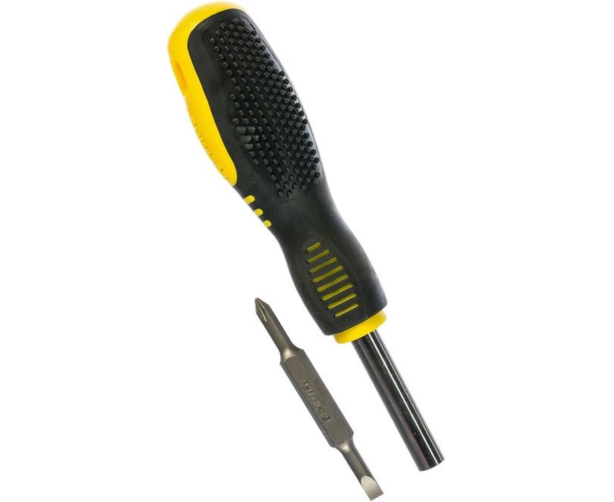 Универсальная отвертка, набор 4 шт. TOPEX 39D516 состоит из широкой пластиковой рукоятки, а также стержня и двух двухсторонних бит.