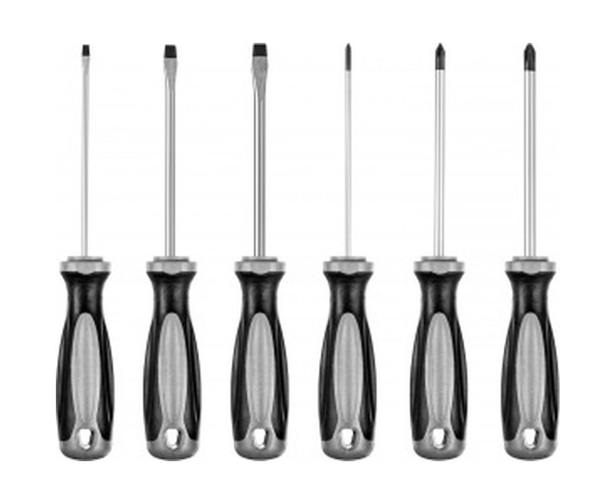 Набор отверток MIRAX 6 предметов 25186 имеет в комплекте три отвертки с прямым шлицем и три отвертки с крестовым. Инструменты позволяют закручивать и откручивать крепежные элементы. Стальной стержень устойчив к износу, поэтому имеет долгий срок службы.