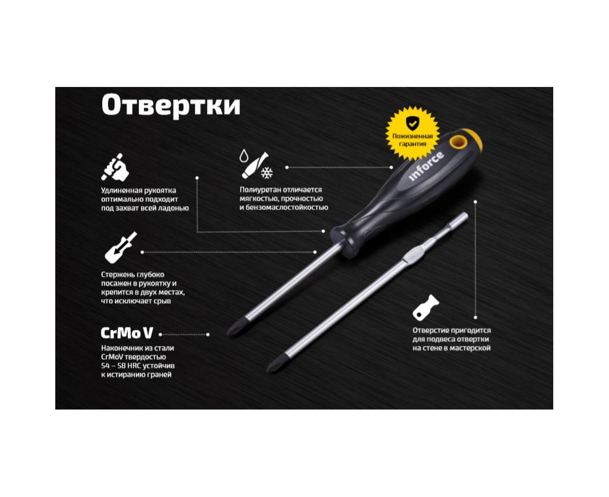Отвертка Inforce PZ1x80 06-09-63 удобна в использовании за счет маслобензостойкой полиуретановой рукоятки, которая не скользит в руках и не натирает ладони.