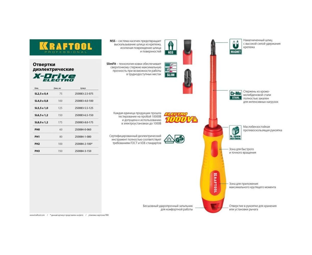 Отвертка KRAFTOOL высоковольтная, Cr-Mo-V стержень, двухкомп. маслобензостойкая рукоятка, PH №2, 100мм 250084-2-100
