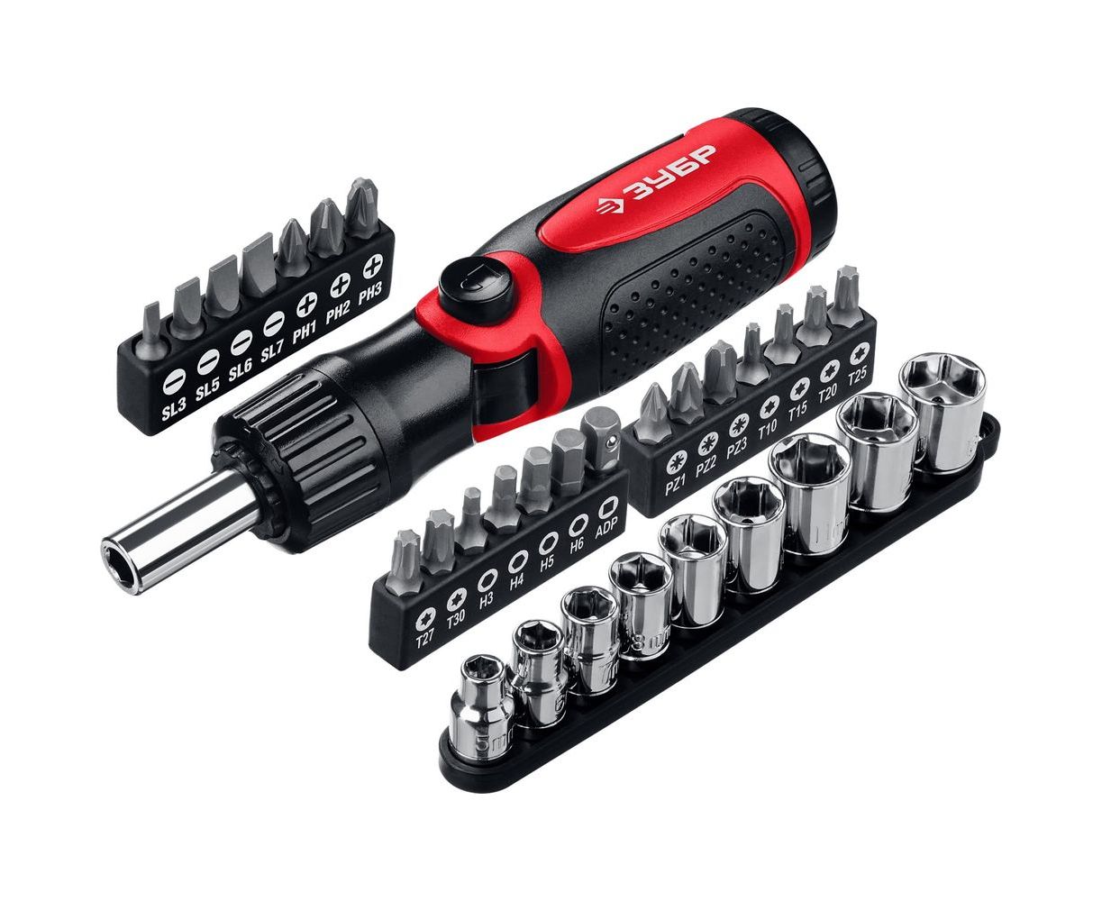 Отвертка с насадками Зубр МАСТЕР 25161-H31 включает в себя набор самых популярных типоразмеров бит и головок. Предназначена для обслуживания различных резьбовых соединений.