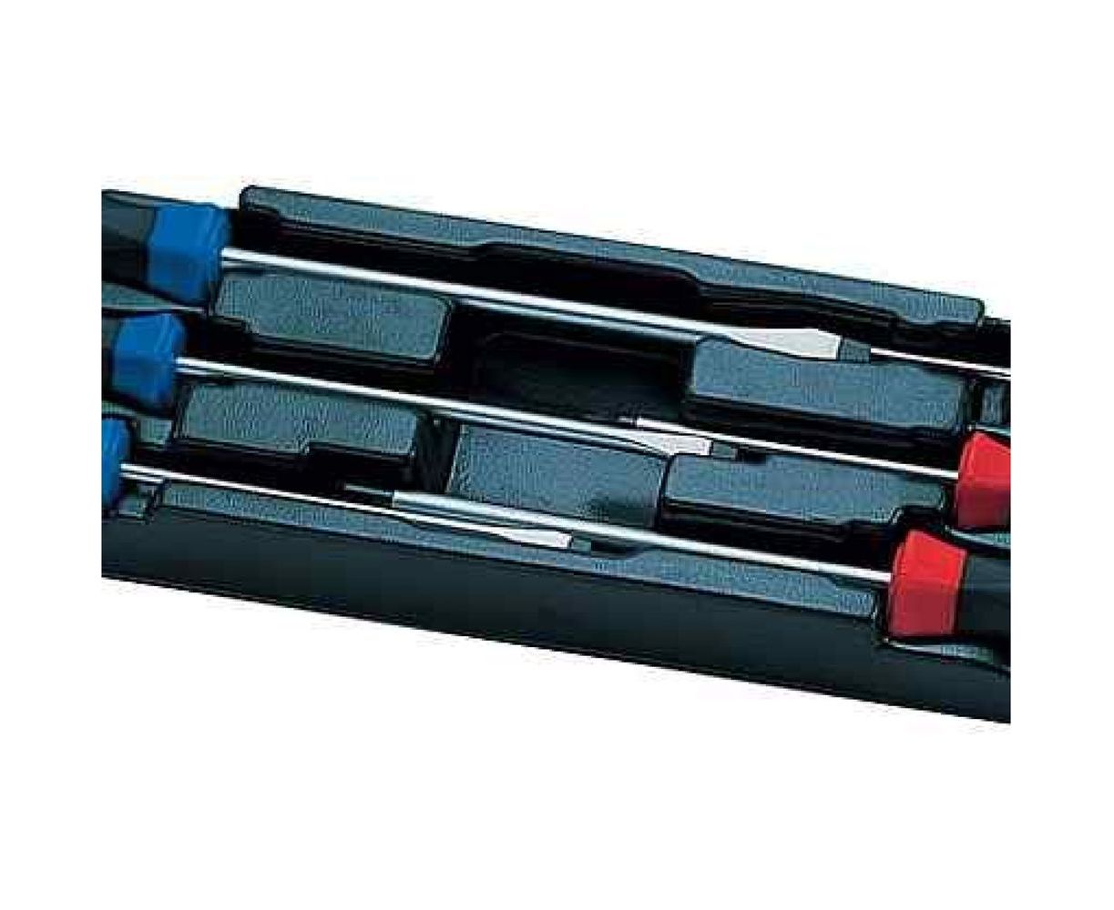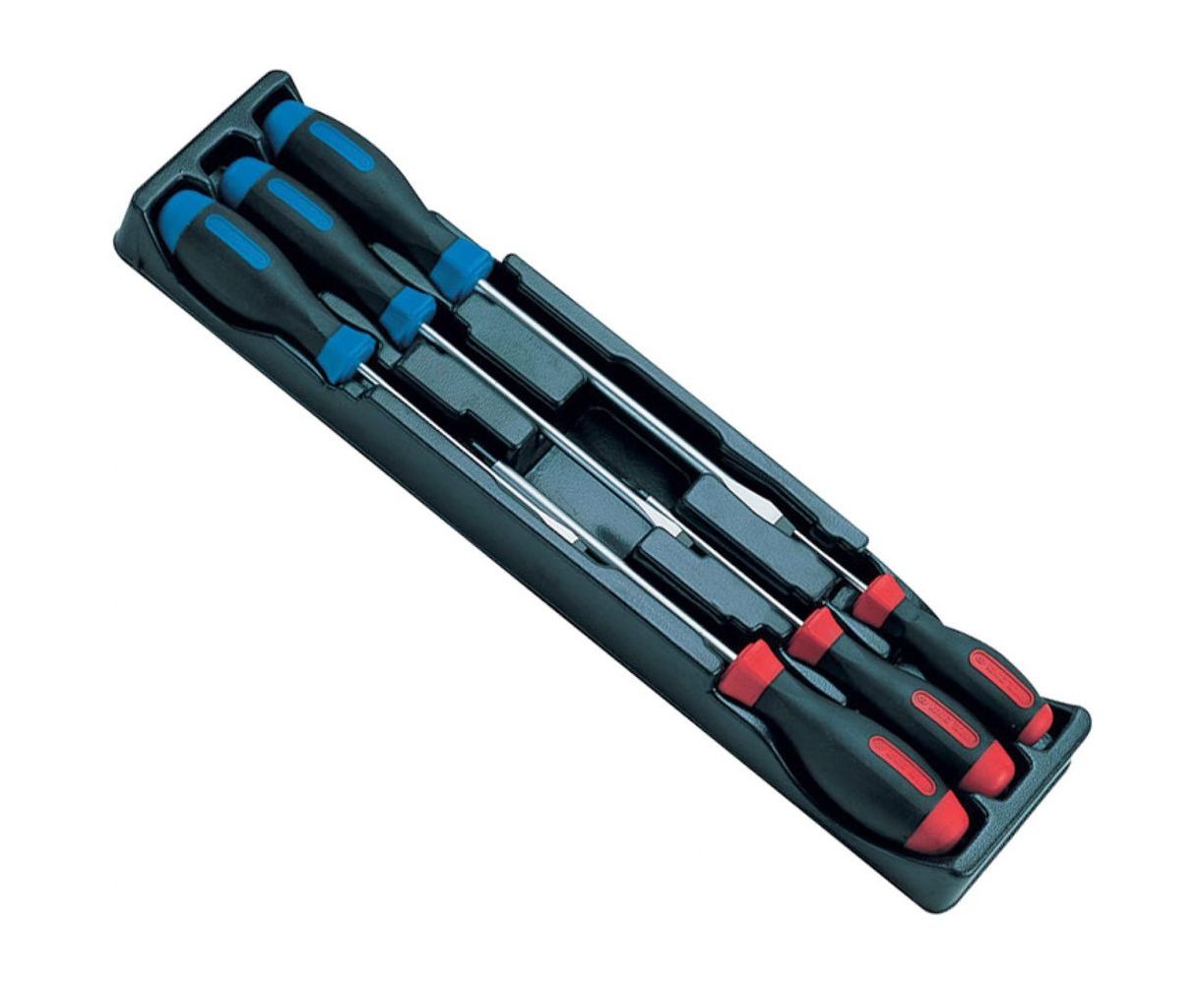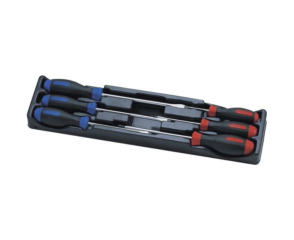 Набор отверток, ложемент, 6шт KING TONY 9-30106MR широко распространен для использования как в быту, так и в профессиональной сфере для выполнения крепежных операций с винтами, имеющими плоские и крестовые внутренние рабочие профили. Отвертки располагаются на ложементе, что удобно для дополнения инструментальных тележек.
