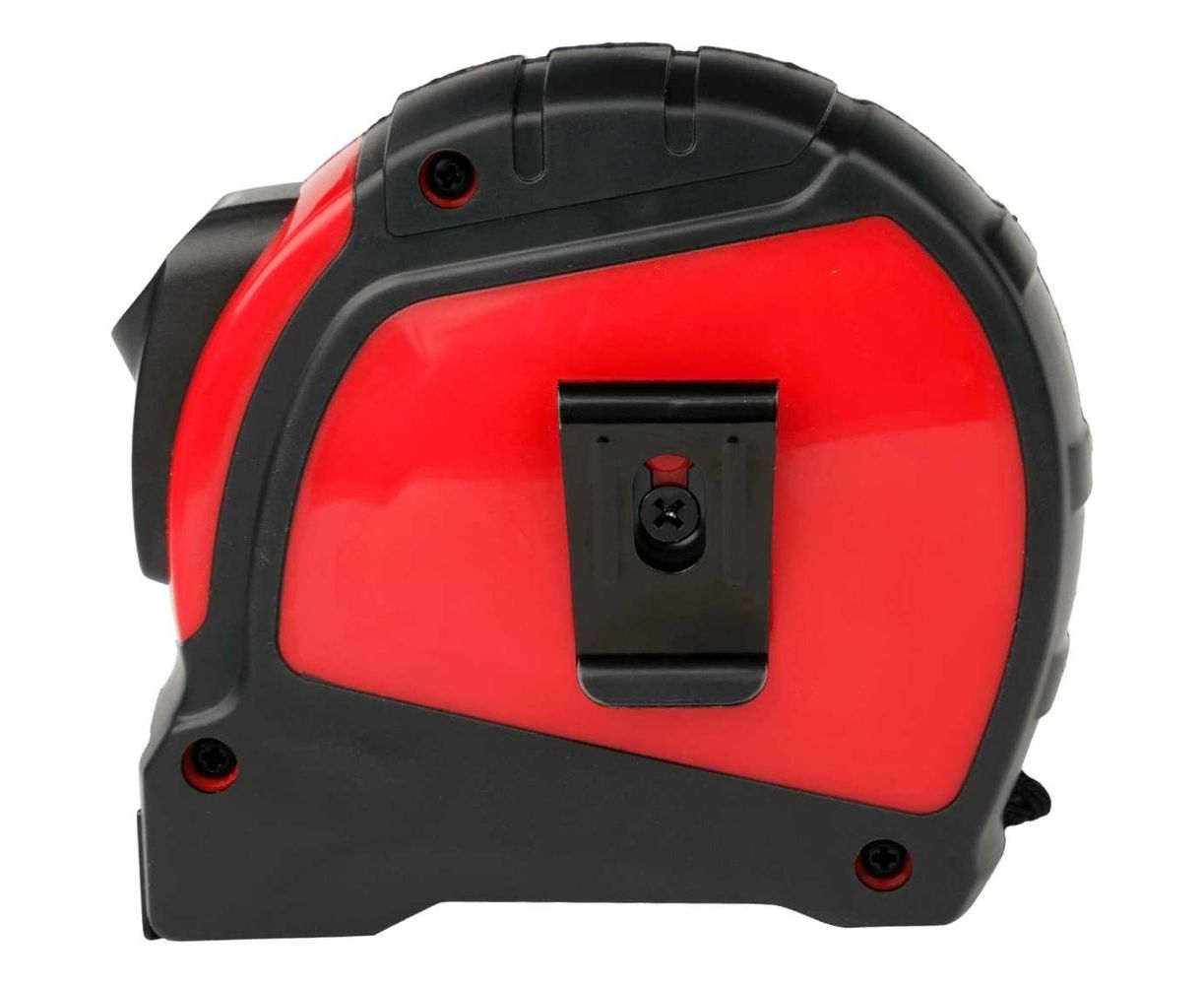 Во время работы рулетку можно прикрепить к рабочему поясу или одежде при помощи металлической клипсы. Также предусмотрен страховочный ремешок на запястье. Рельефное резиновое покрытие дополнительно обеспечивает крепкий хват и значительно снижает вероятность выскальзывания.