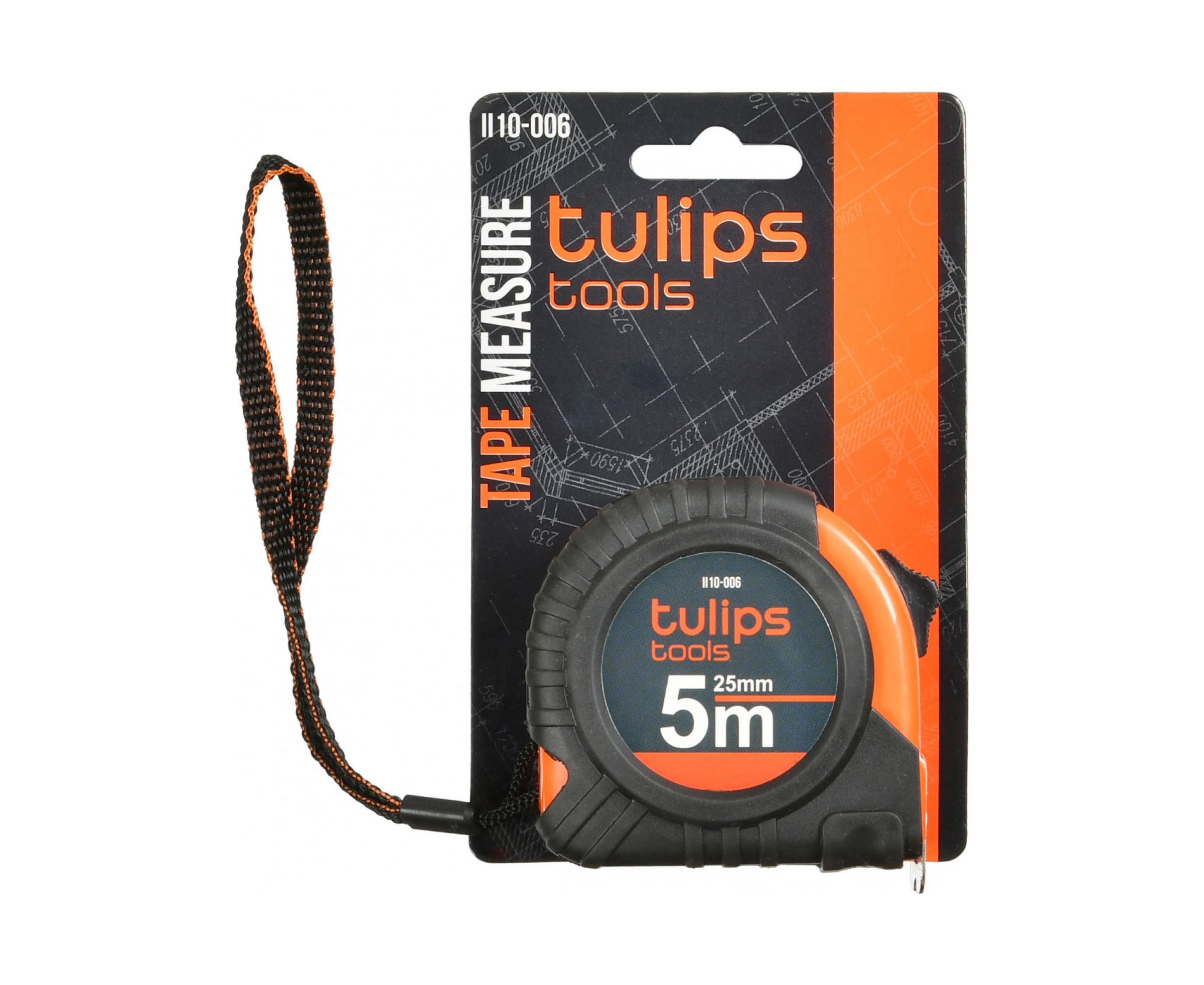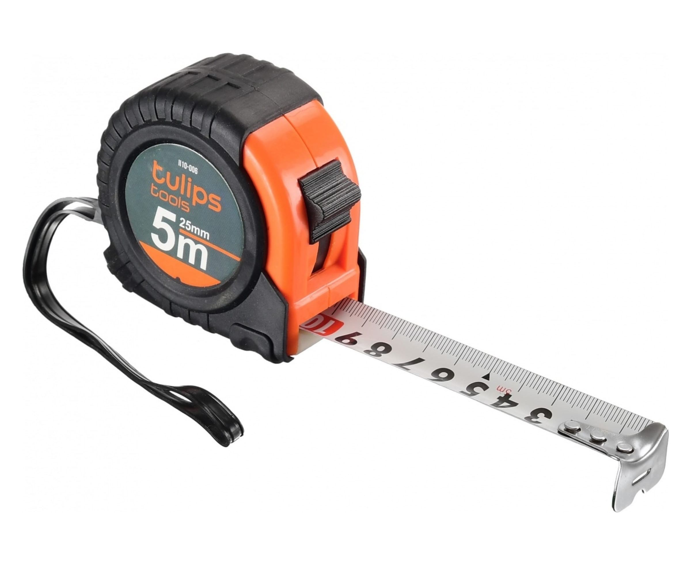 Рулетка 5м/25 мм Tulips tools II10-006 выполнена в корпусе из обрезиненного пластика с рельефной поверхностью, что предотвращает выскальзывание из руки. Зацеп длиною больше стандартного надежно фиксируется на поверхности измеряемой детали.