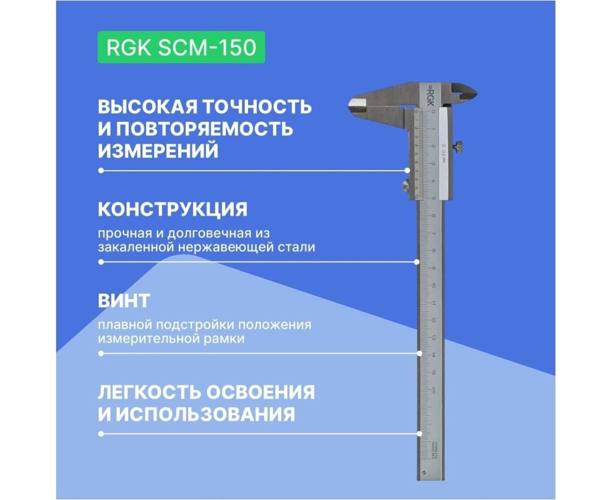 Механический штангенциркуль RGK SCM-150 779517 используется для высокоточного измерения наружных и внутренних линейных размеров, а также - глубин отверстий. Представляет собой прибор высокой точности, который является распространенным инструментом измерения с пределами от 0 до 150 мм, он удобен в обращении, имеет простую конструкцию, и способен проводить измерения с максимальной скоростью.