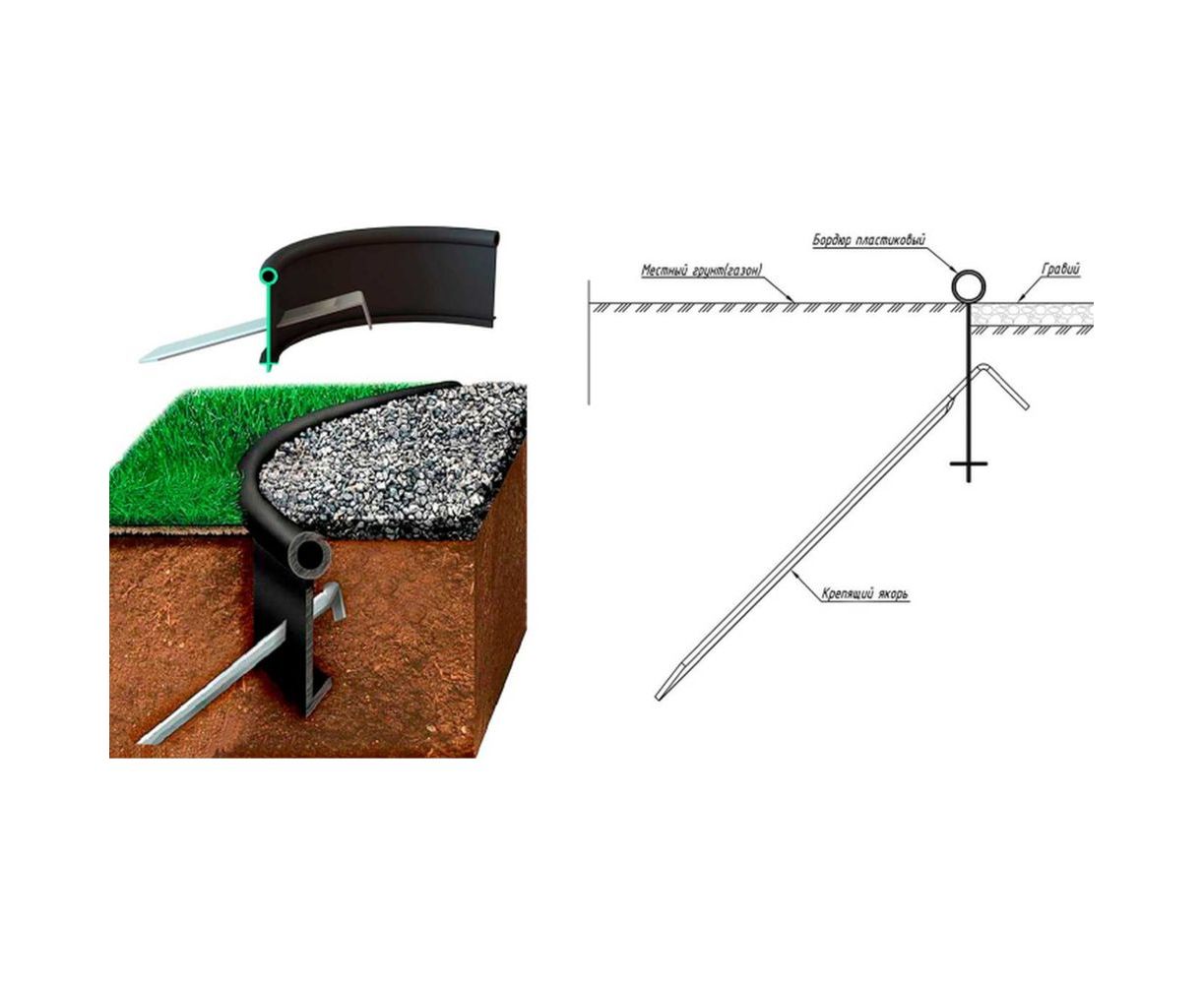 Полотно бордюра или бордюрной ленты пробивается наконечником анкера. Длина анкера 22 см.