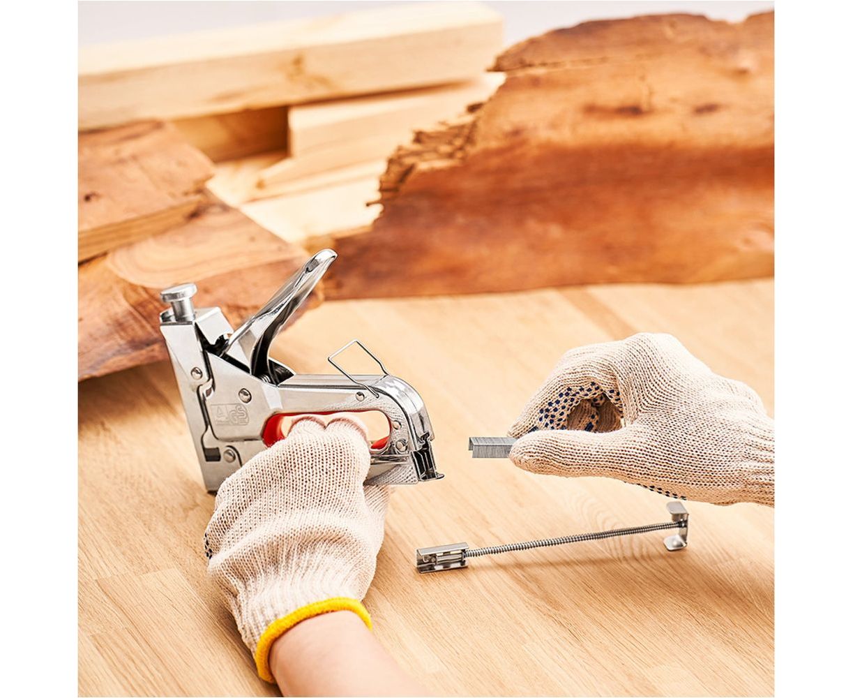 Мебельный степлер REXANT металлический 12-5402 выполнен из высокопрочной стали. Имеет регулировочный винт для оптимальной настройки силы удара. Предназначен для закрепления обивки мебели, сборки шкафов, укрепления плакатов, строительства парников, укладки напольных покрытий, закрепления проволочной сетки и других подобных работ. Корпус оснащен специальной скобой, которая фиксирует ручку и упрощает хранение степлера. Инструмент укомплектован скобами. Степлер может использоваться в быту, мастерских, на производстве.