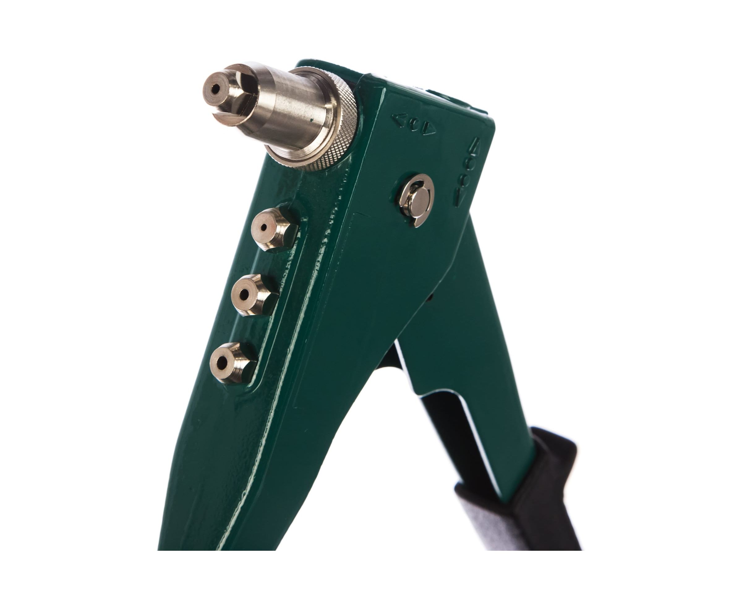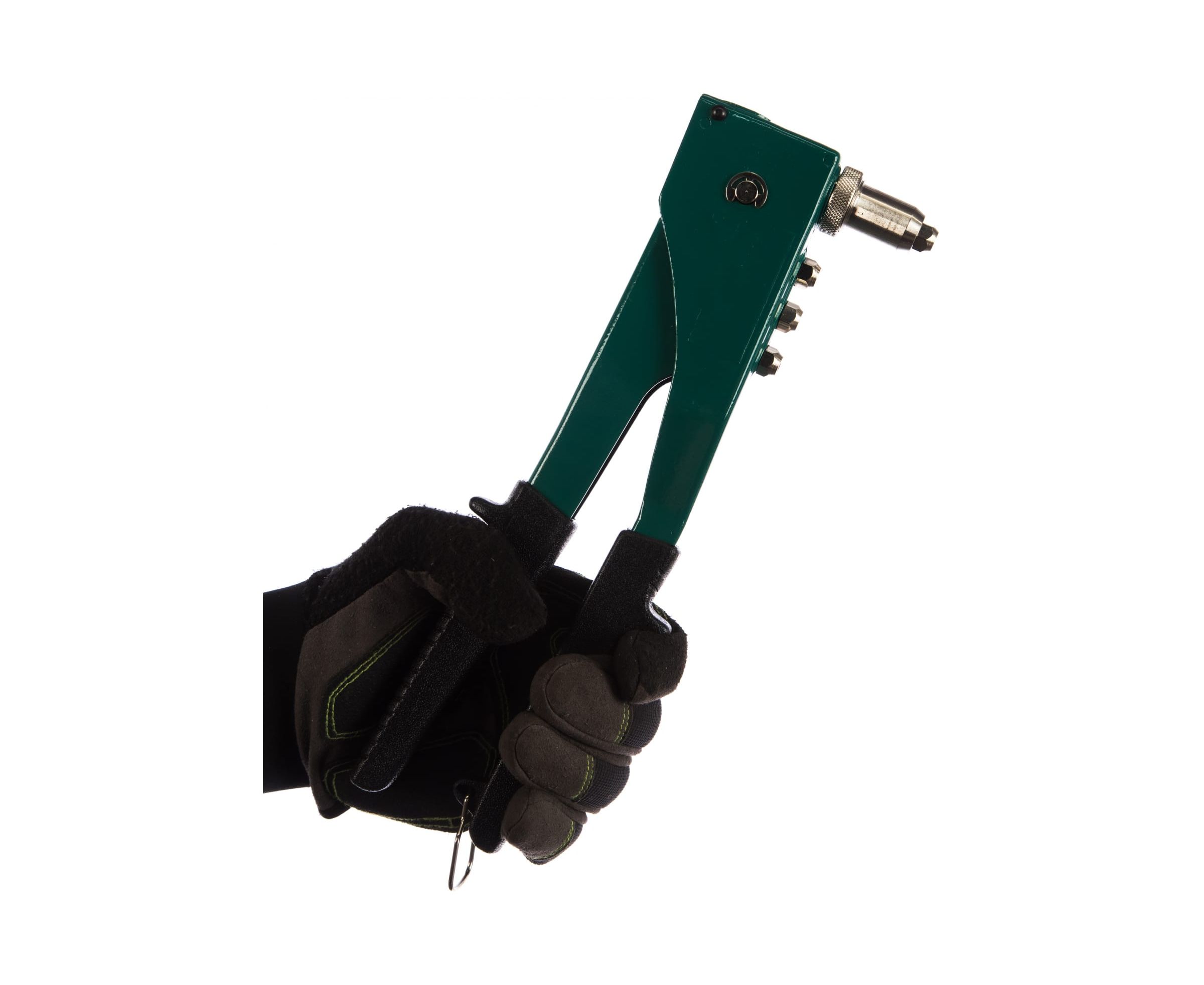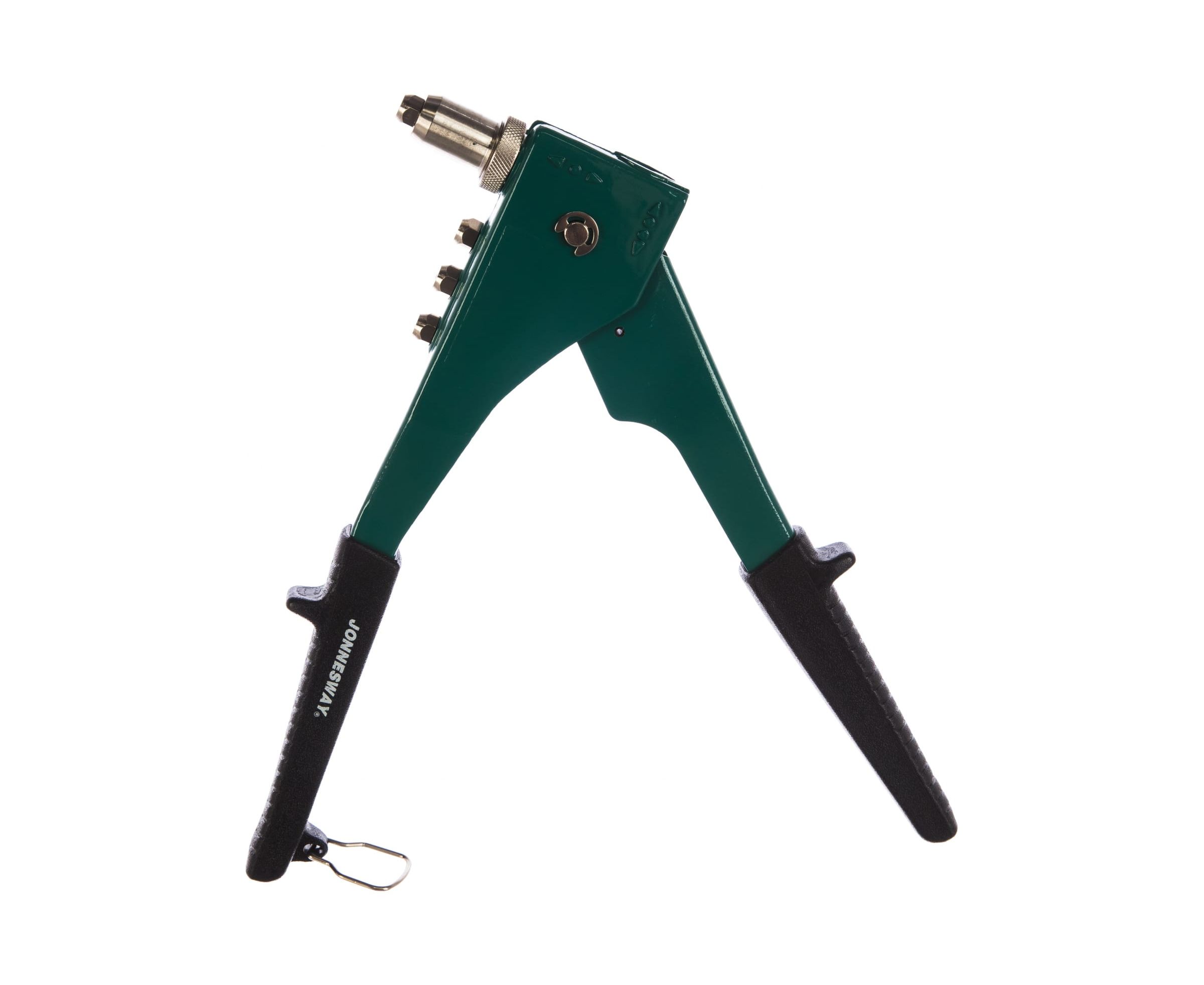 Двусторонний заклепочник Jonnesway V1005 используется для работы в труднодоступных местах. Заклепочную головку можно переставлять в верхнюю часть инструмента или в боковую. Специальные накладки на рукоятках обеспечивают надежный хват.