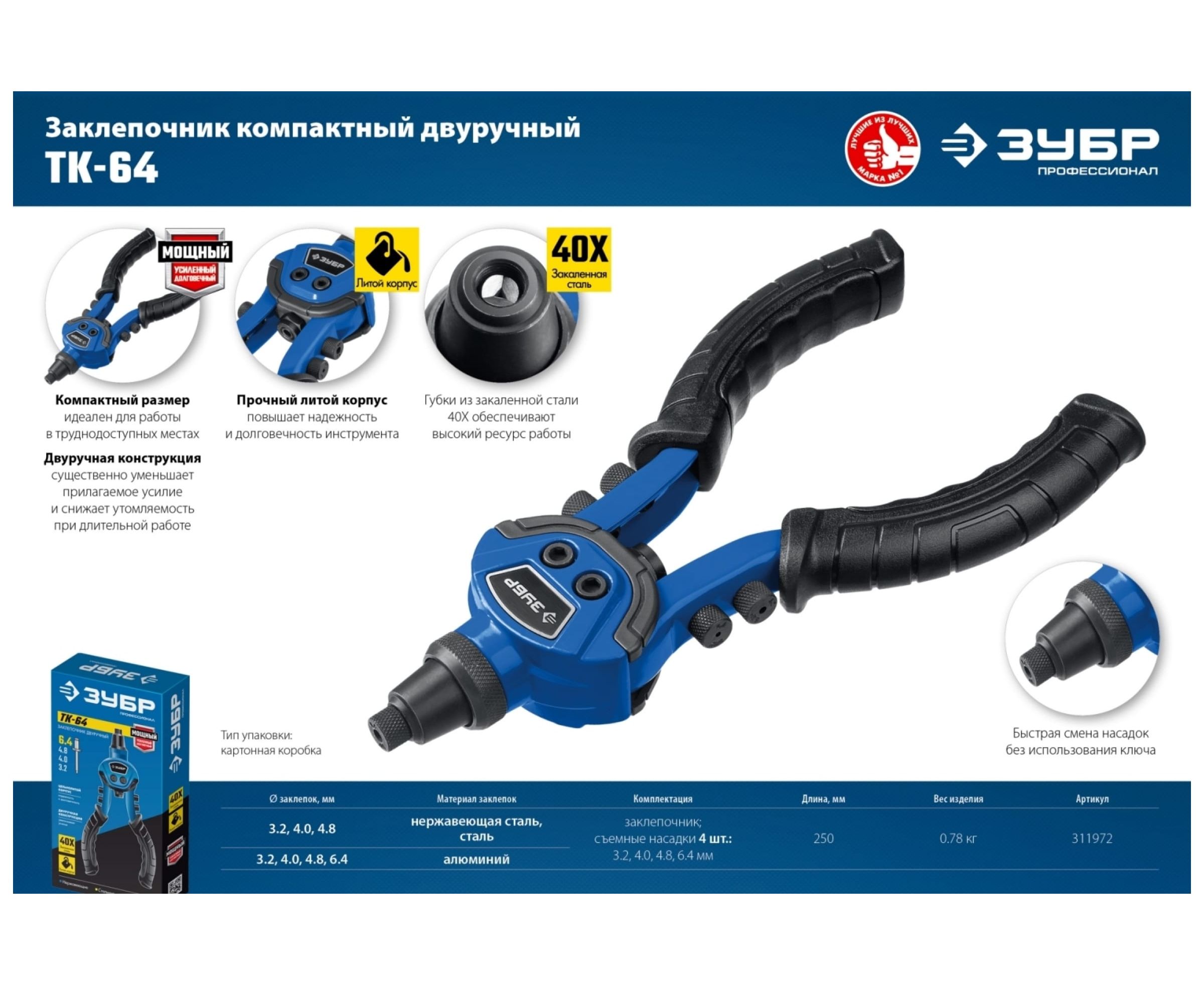 Компактный двуручный заклепочник ТК-64 ЗУБР 311972