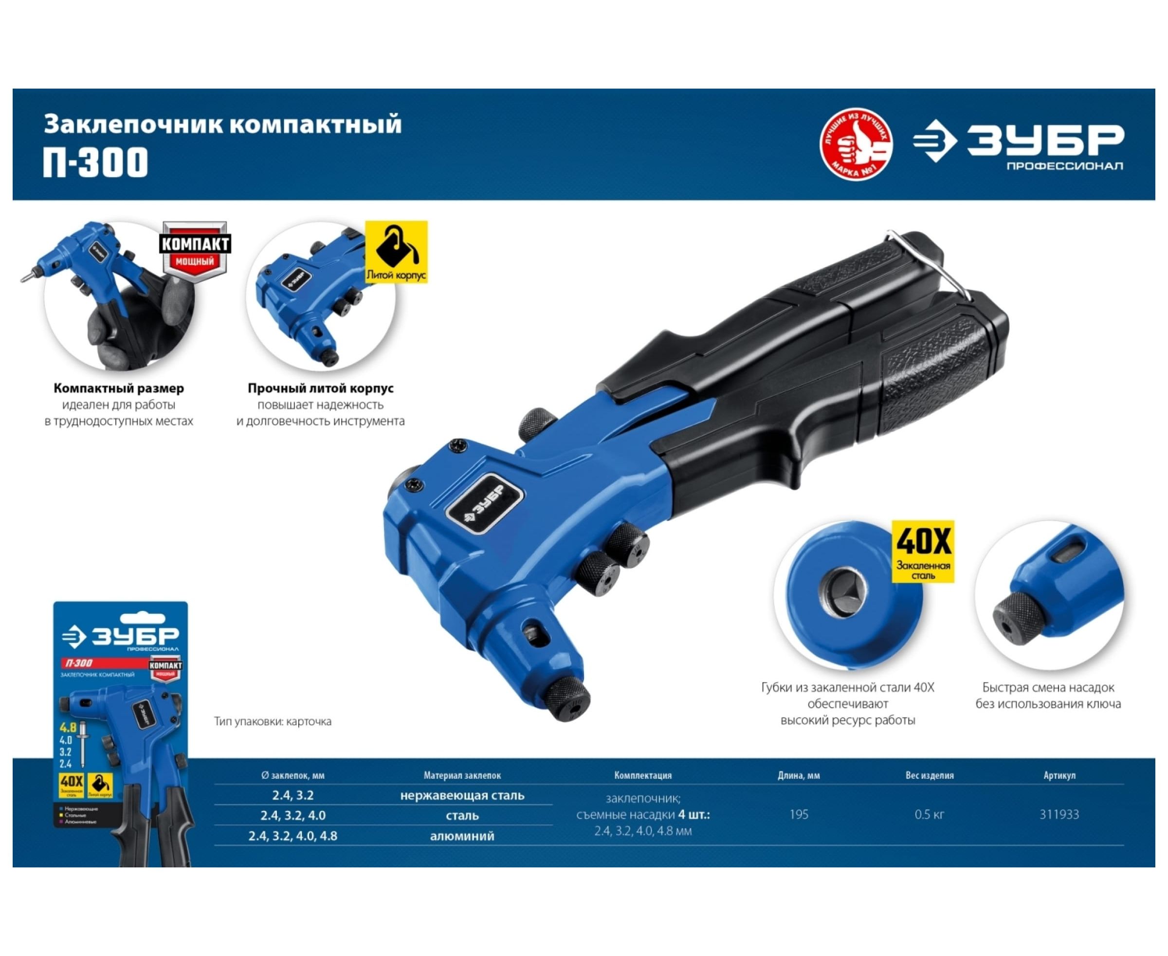 Компактный литой заклепочник ЗУБР Профессионал П-300 195 мм, 2.4 - 4.8 мм 311933 - это удобный и надежный, профессиональный инструмент для соединения листовых материалов с помощью заклепок.