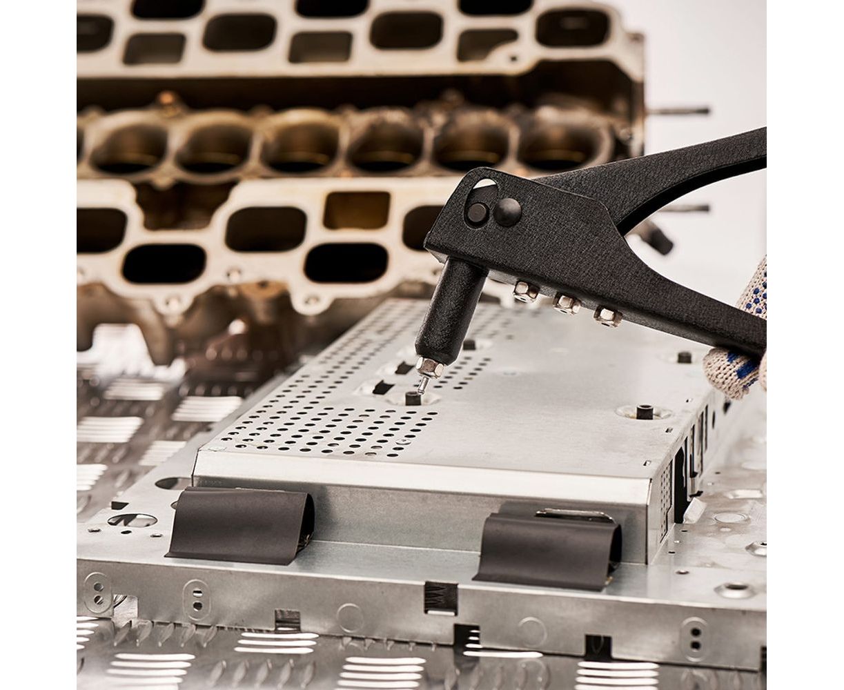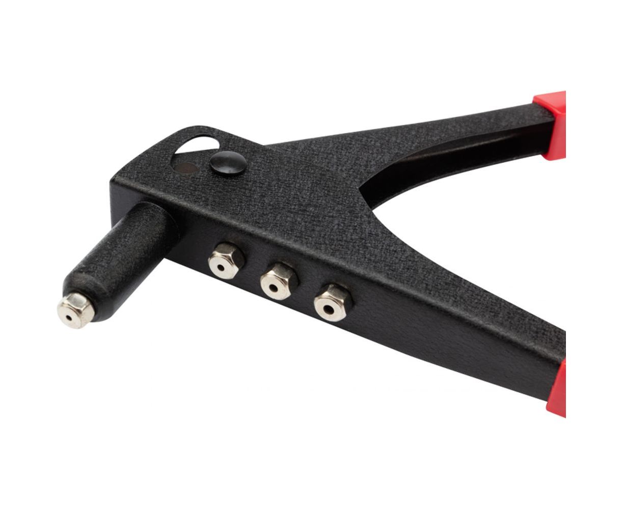 Корпус инструмента изготовлен из высококачественной стали, которая обеспечивает прочность инструмента. Резиновые накладки на рукоятках эргономичной формы делают работу более комфортной, а специальная скоба на конце упрощает хранение заклепочника.