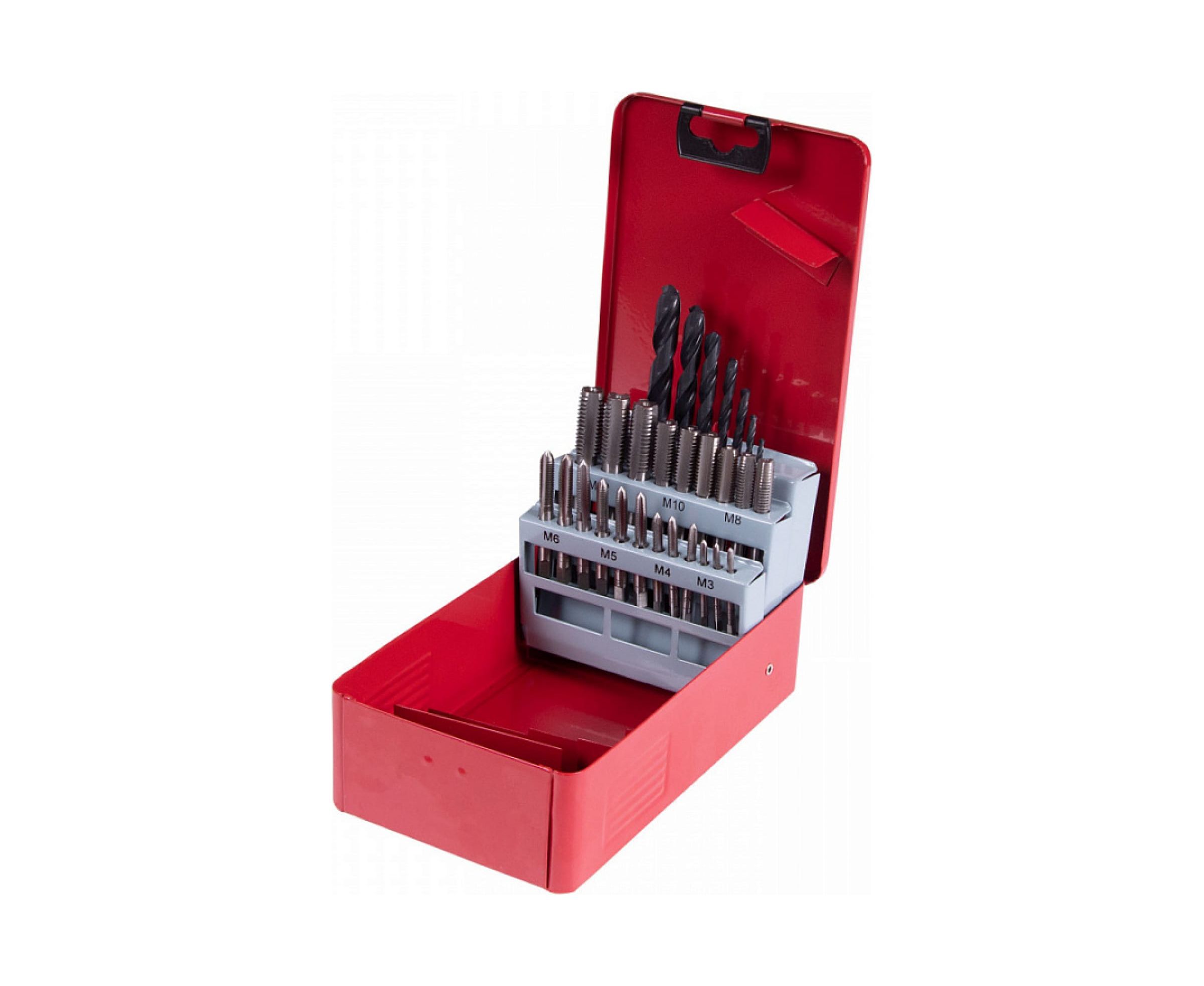 Набор метчиков и сверл KING TONYл HSS-G М3-М12, 28 предметов 11328SQ используется для нарезки резьбы. Сверла выполнены из быстрорежущей стали HSS высокого качества. Материал обладает высокой прочностью и способностью долго сохранять остроту режущей кромки. Метчики из вольфрамовой стали отличаются высокими прочностными характеристиками, твердостью, износостойкостью и жаростойкостью. Стальной кейс позволяет рационально хранить и транспортировать инструмент.