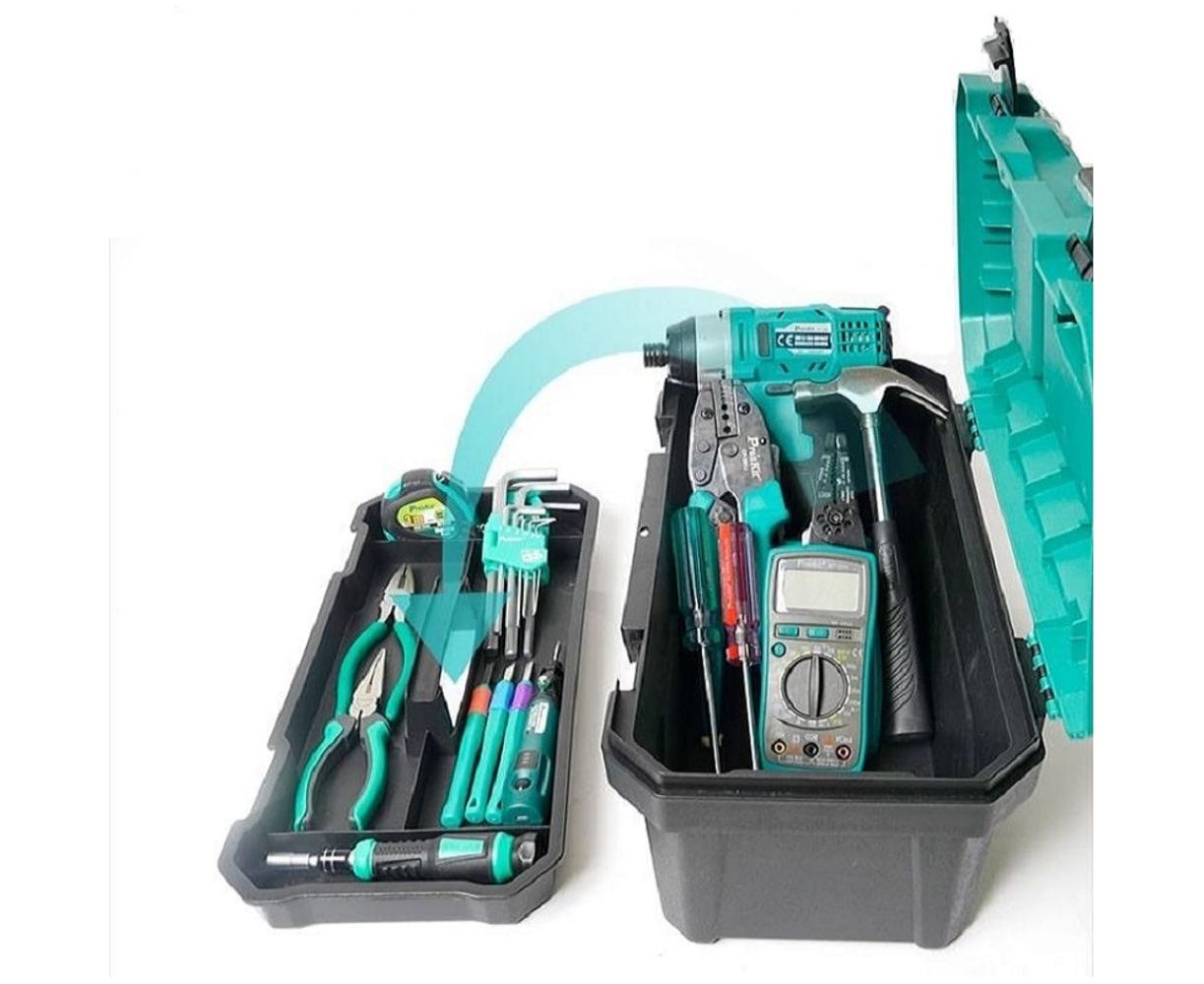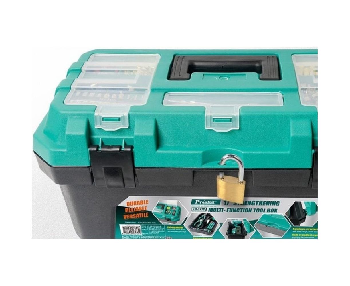 Ящик для инструментов ProsKit пластиковый 420x230x200 мм SB-1718 (аналог SB-4121) С00040188 - многофункциональный усиленный ящик для инструментов со съемным лотком. Способен выдержать нагрузку до 15 кг. Для удобства в крышке есть органайзер для мелких деталей.