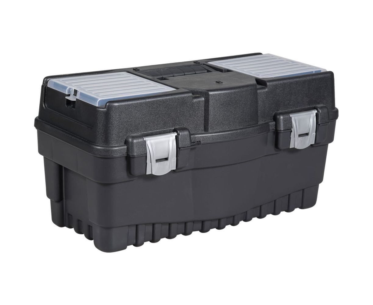 Ящик для инструментов STANDARD BASIC МастерАлмаз 462x256x242 мм 10501214 имеет одно отделение. На крышке ящика два органайзера, петля под замок. Надежные металлические замки.