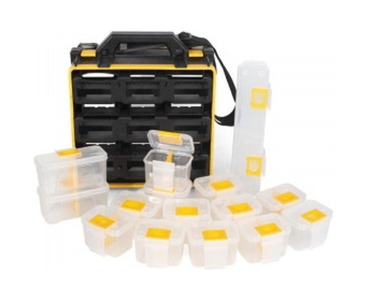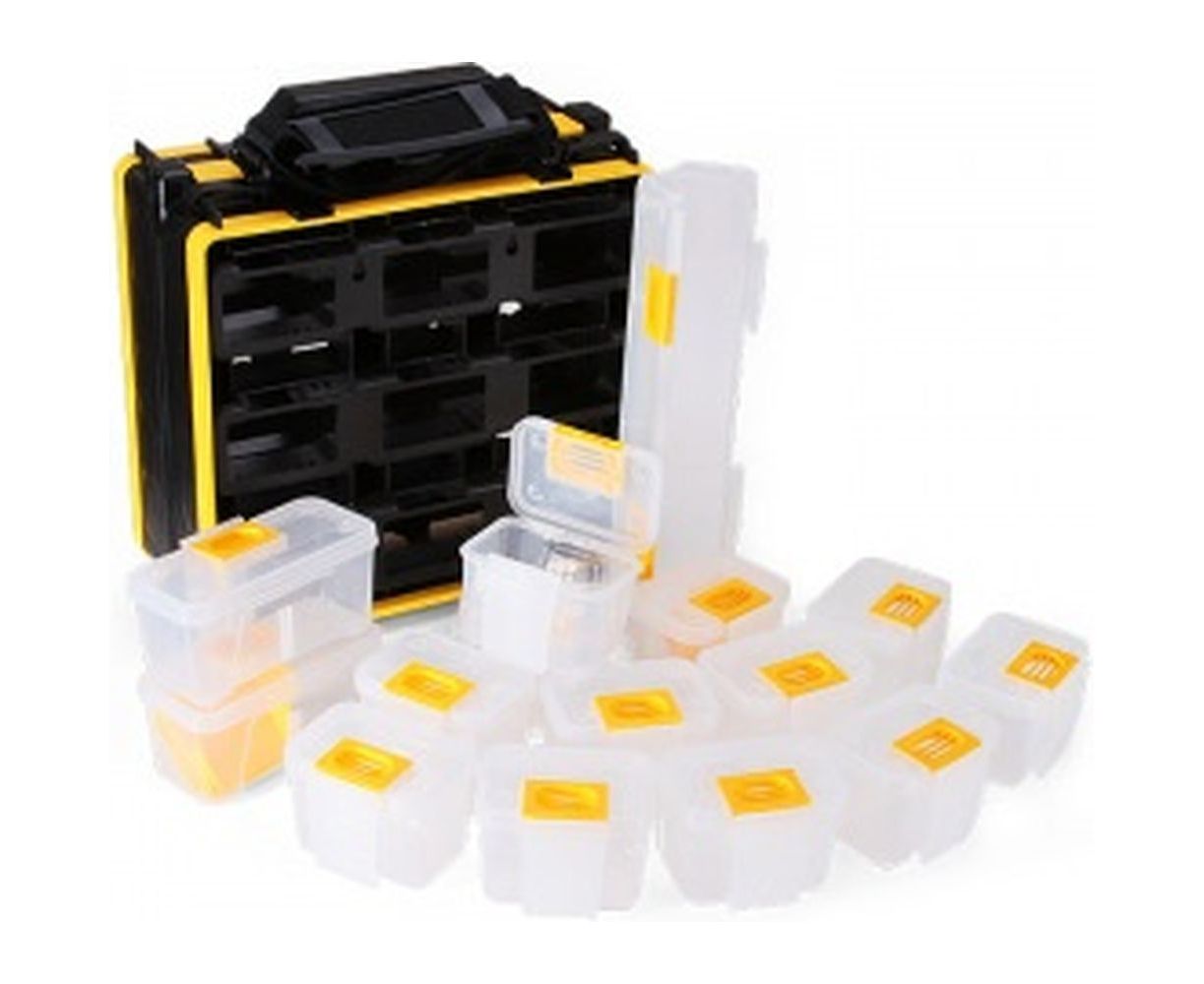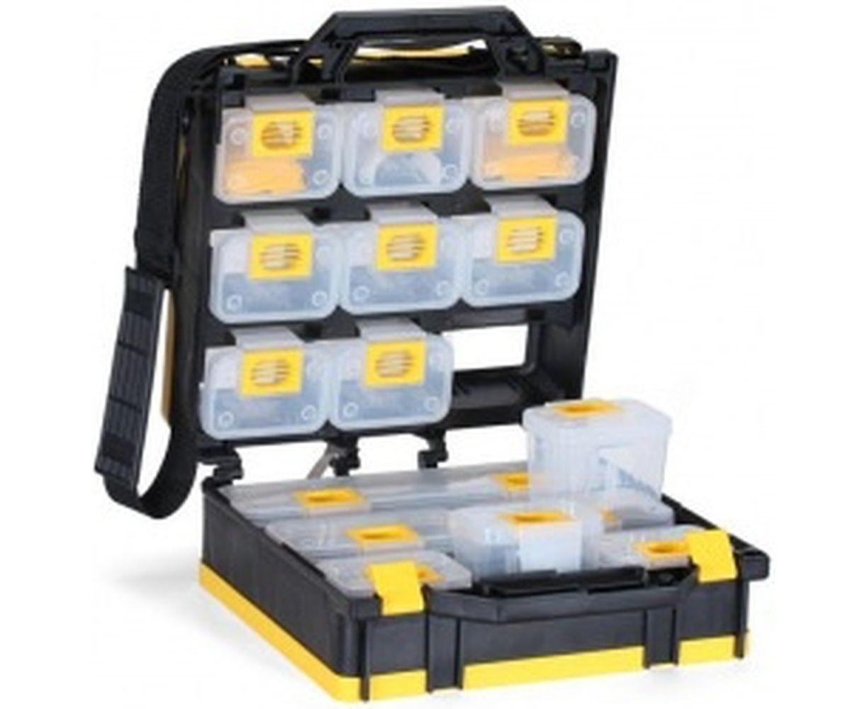 Кейс-органайзер КВТ К-01 76805 является удобным мобильным хранилищем мелких принадлежностей, инструментов, крепежных элементов и т.д. Прозрачный двусторонний пластиковый корпус открывается на 180°, внутри него размещены 15 разных по величине модулей. Благодаря съемному плечевому ремню с резиновым наплечником кейс легко и удобно транспортировать. Каждый модуль выполнен из прозрачного пластика, имеет удобную защелку на крышке и надежно фиксируется в органайзере пластиковой клипсой. Данный кейс можно повесить у себя в мастерской на любой вертикальной поверхности, для этого предусмотрены отверстия на его боковых стенках.