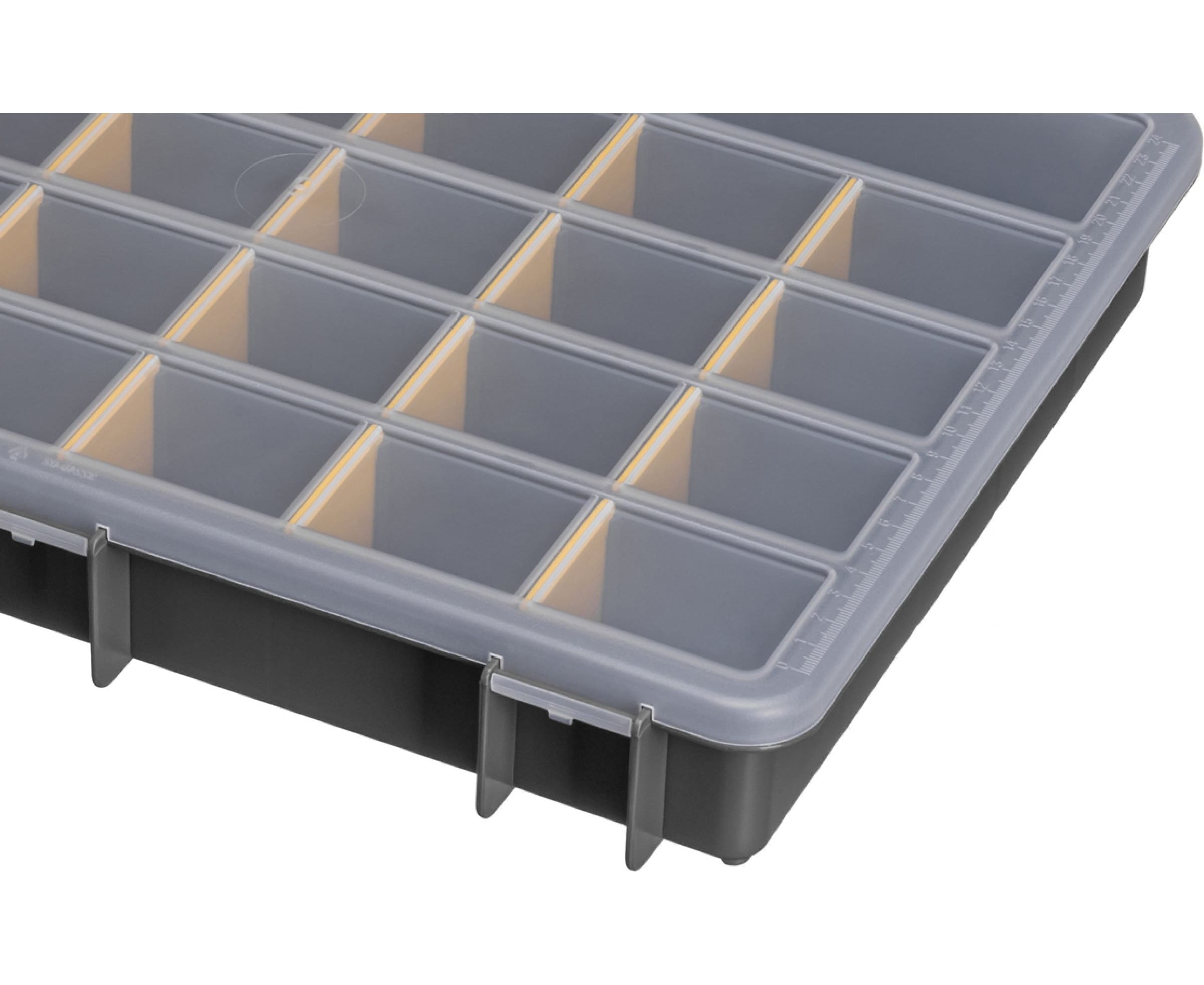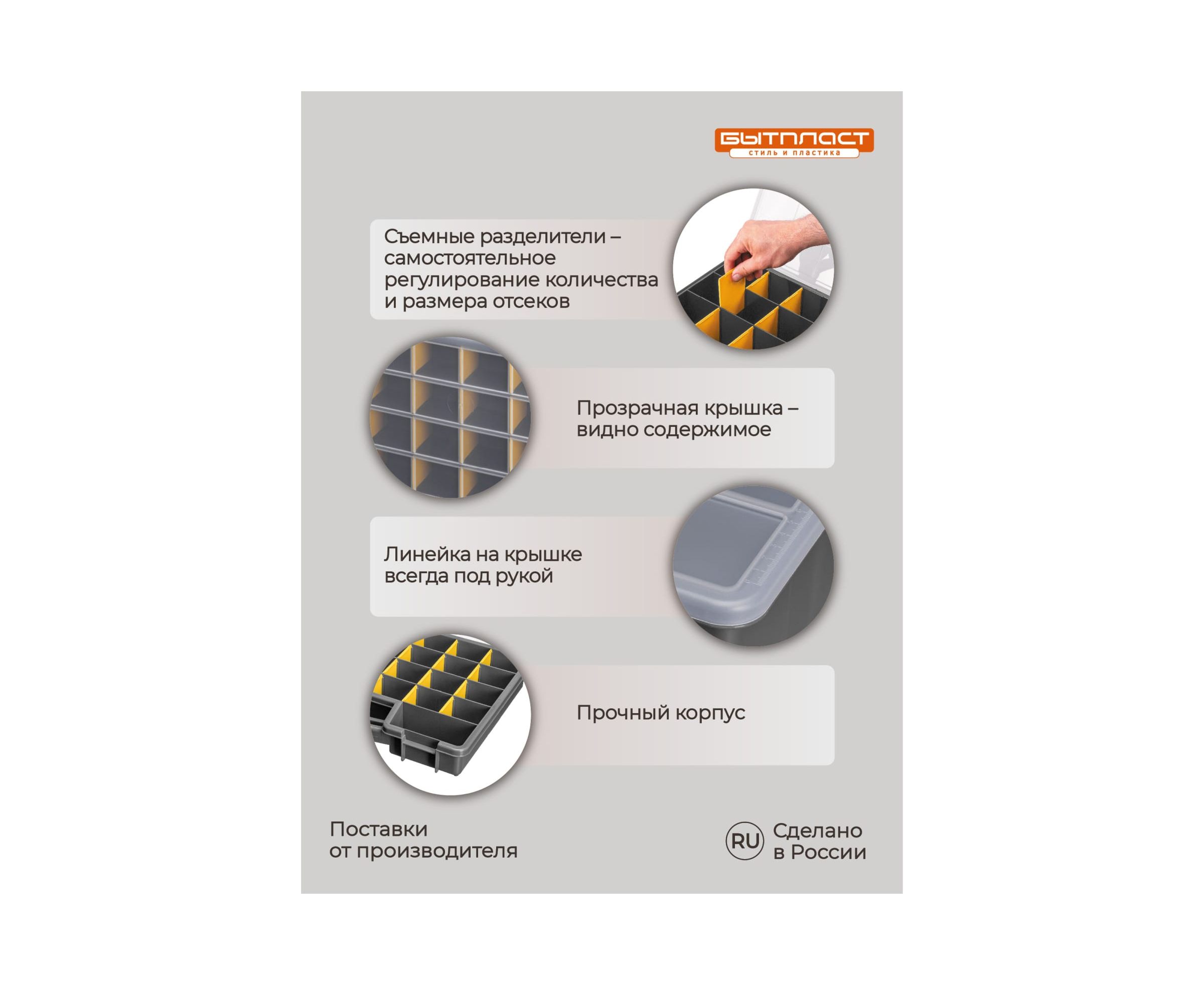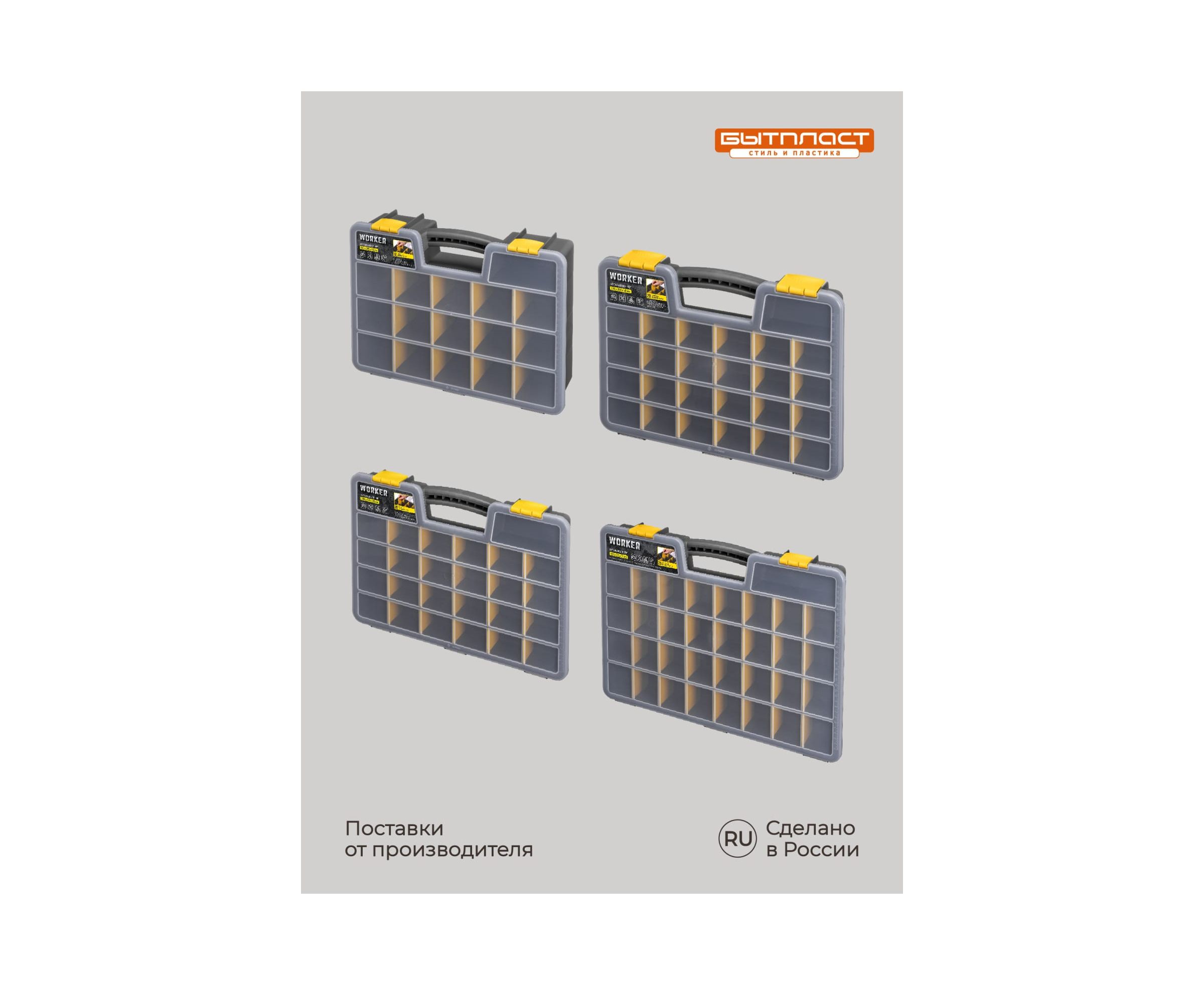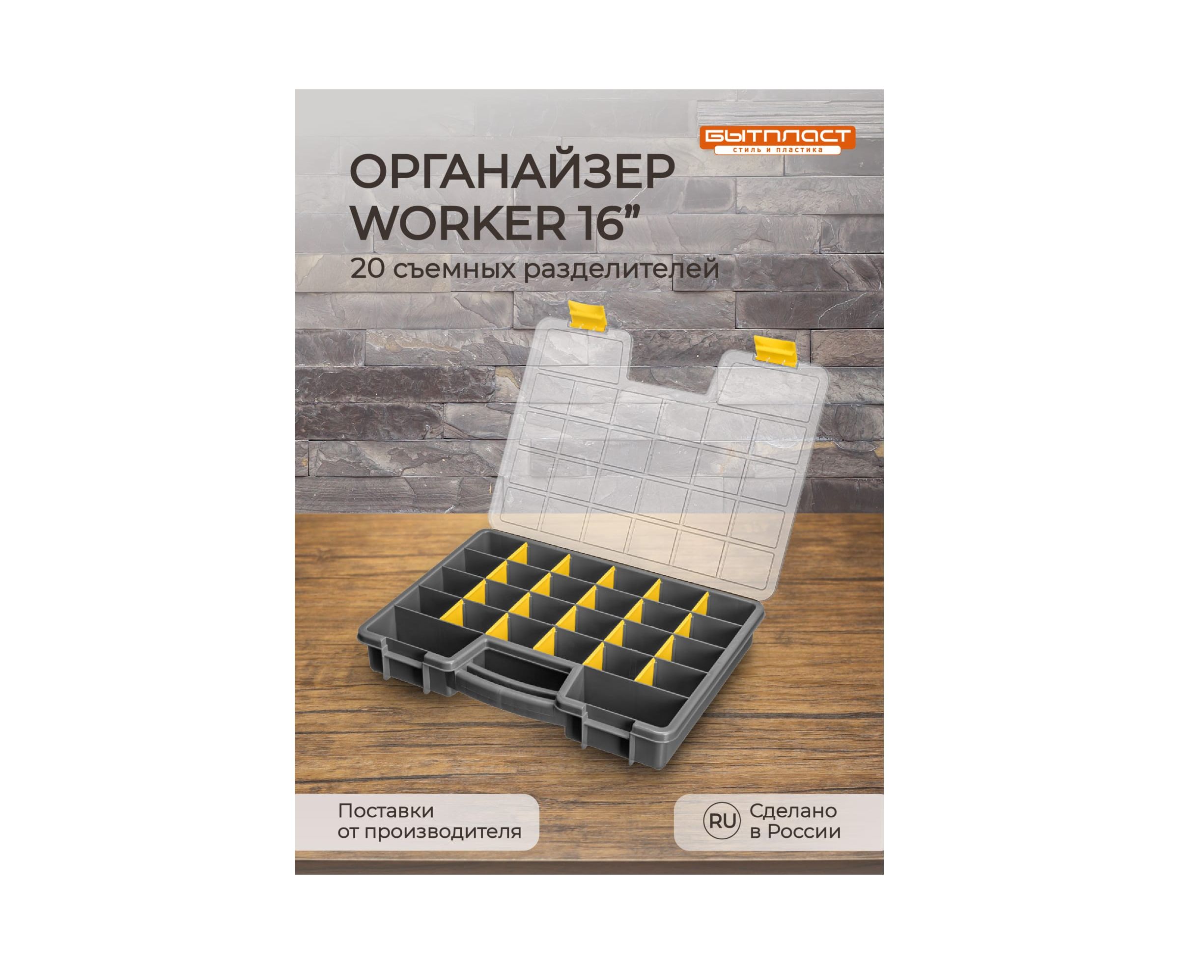Органайзер Бытпласт WORKER 16", 390х295х60 мм, серый 433240311 предназначен для хранения строительных материалов. Поможет рассортировать крепежные и другие материалы: саморезы, гвозди, дюбели, болты, винты и пр. Внутри органайзера - съемные подвижные разделители, с помощью которых при необходимости можно сформировать ячейки нужного размера.