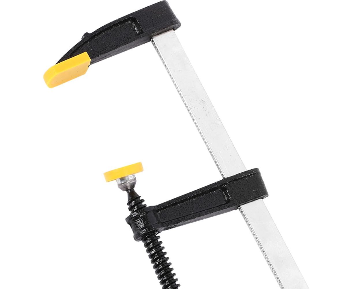 Столярная F-образная струбцина используется в столярном, слесарном и плотницком деле и позволяет фиксировать заготовки из металла, древесины, пластика и других материалов для их соединения, обработки, склеивания, шлифовки, сверления и пр. Ширина зажима составляет 800 мм, а глубина до 120 мм. Штанга изготовлена из высококачественной стали А3 и толщиной 5 мм, устойчива к деформации и прослужит долго. Диаметр резьбового стержня 12 мм. Максимальное усилие зажима 2000 Н. Эргономичная, двухкомпонентная рукоять удобно лежит в руке и обеспечивая комфорт во время работы.