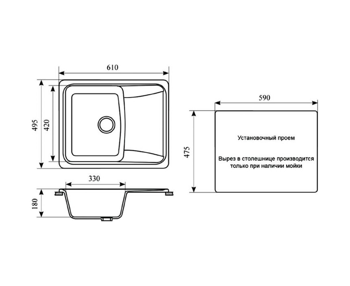 - Размер выреза в столешнице для установки мойки - 590х475 мм.