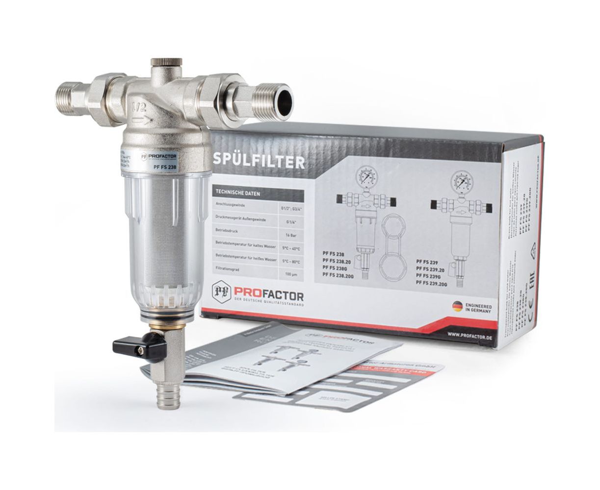 Промывные фильтры PROFACTOR® поставляются в двух вариантах комплектации по типу колб: пластиковая прозрачная колба – рекомендуется для холодной воды; из никелированной латуни – для горячей воды.