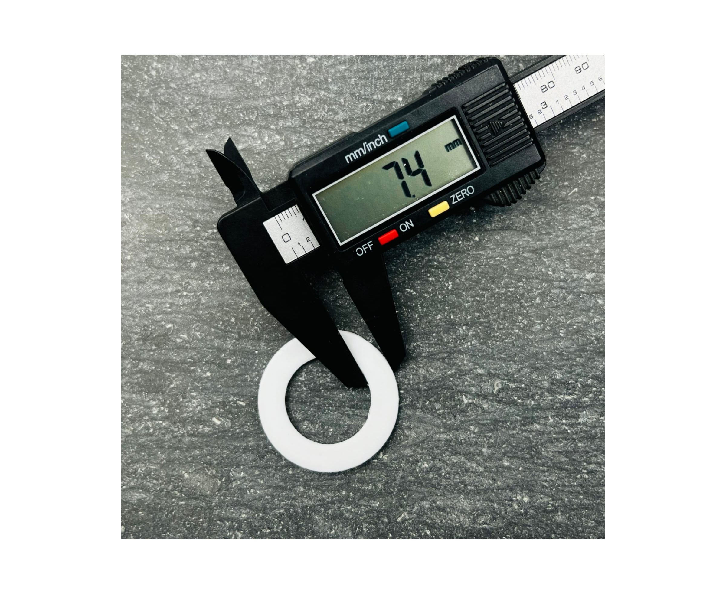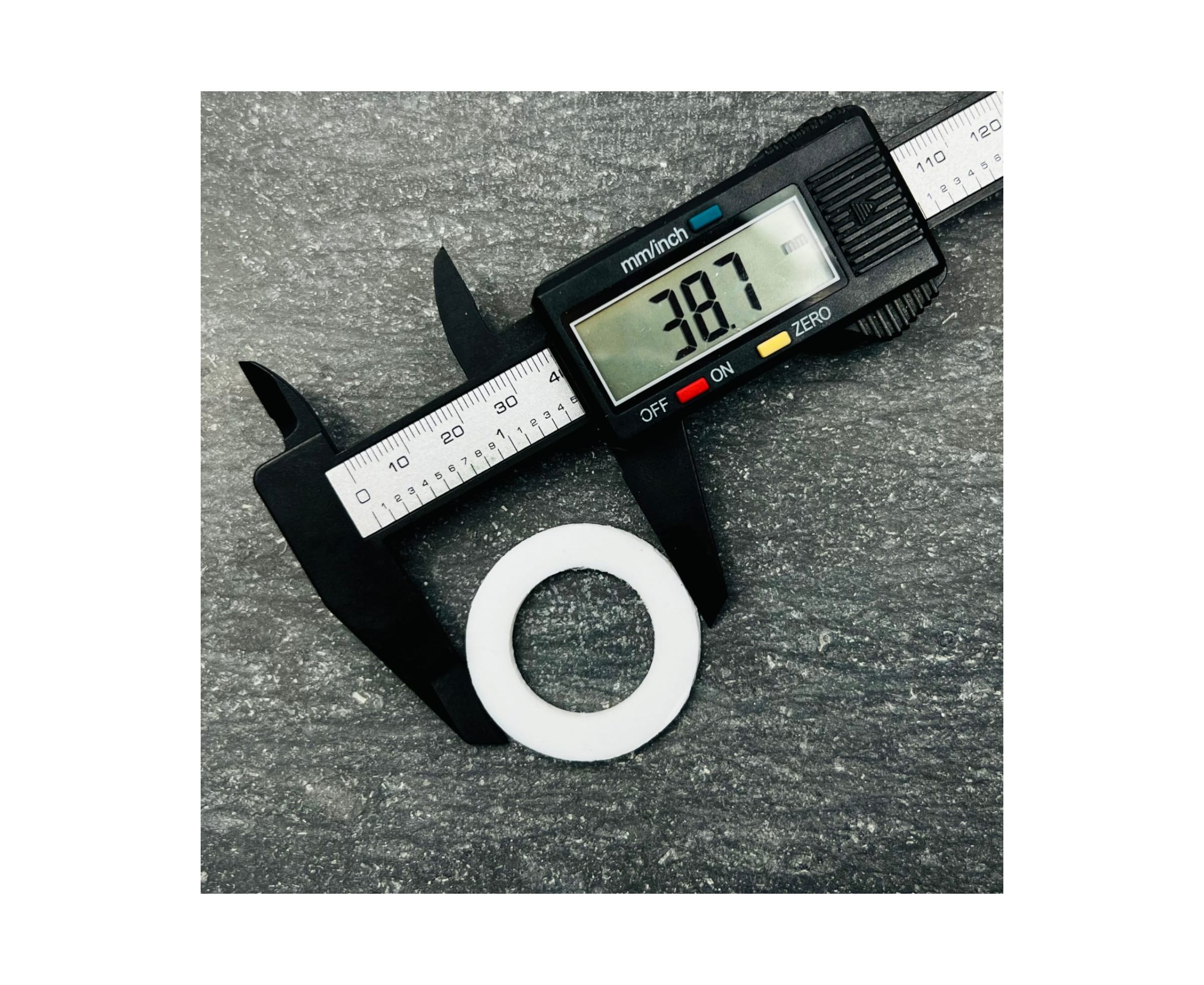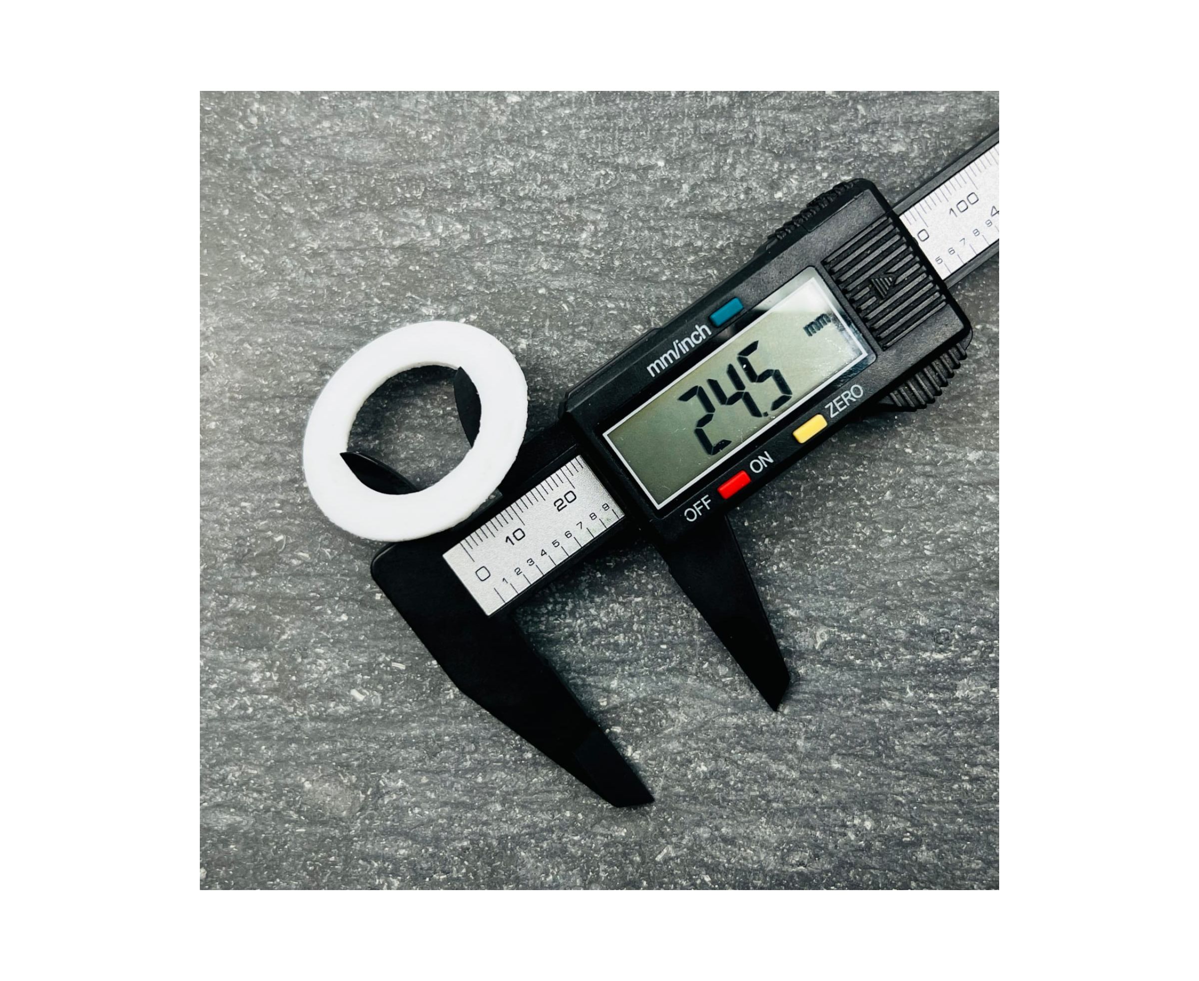 Внутренний диаметр - 24 мм, наружный диаметр - 37 мм, толщина - 2 мм.