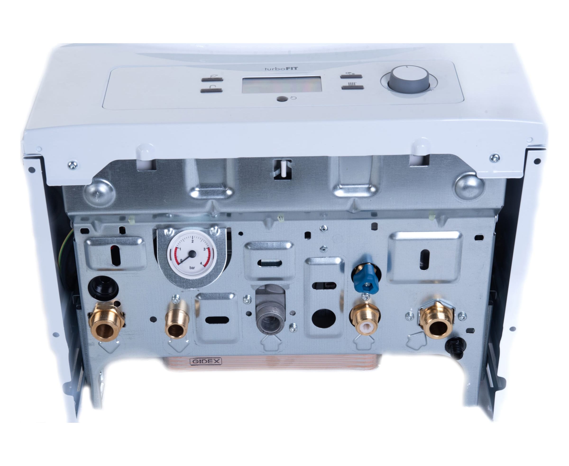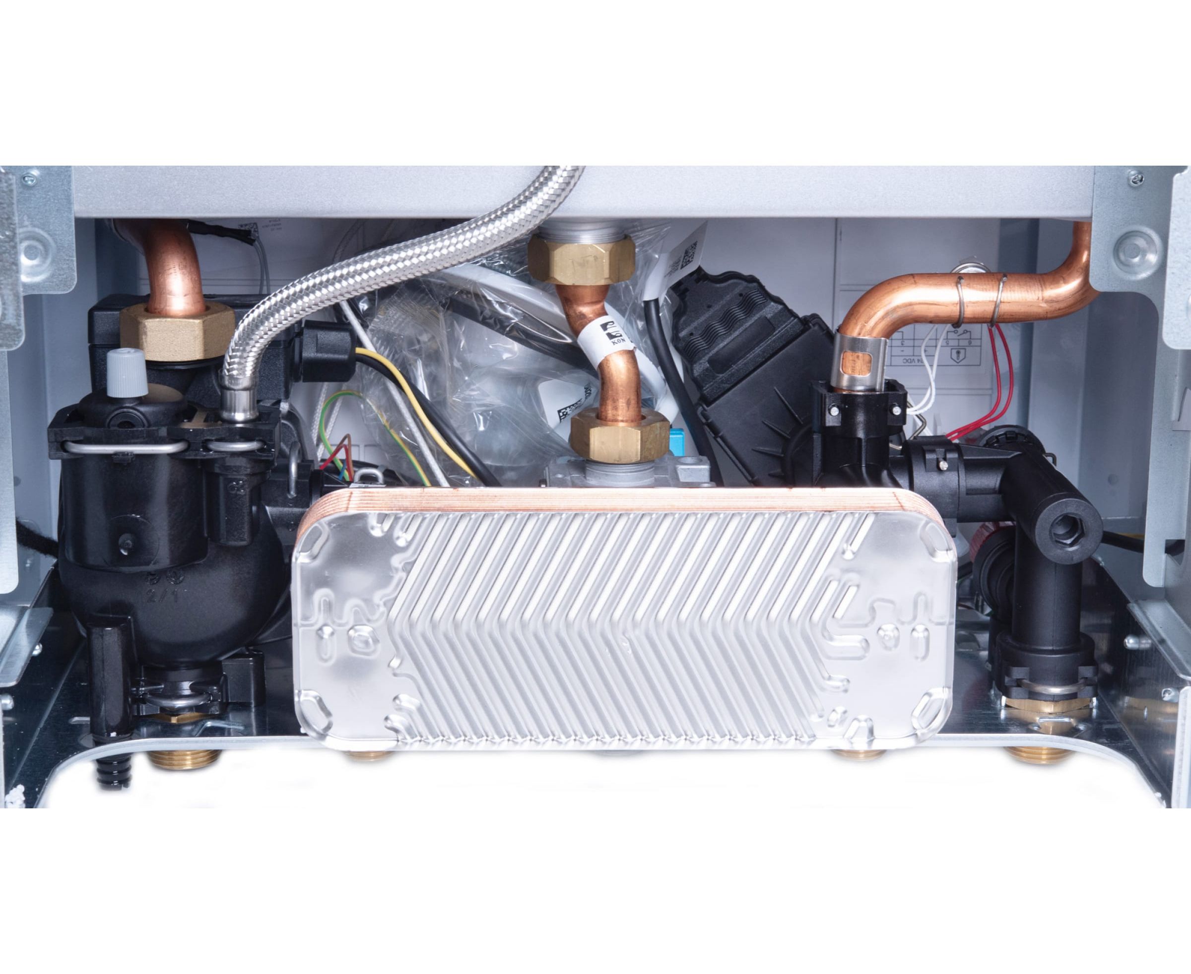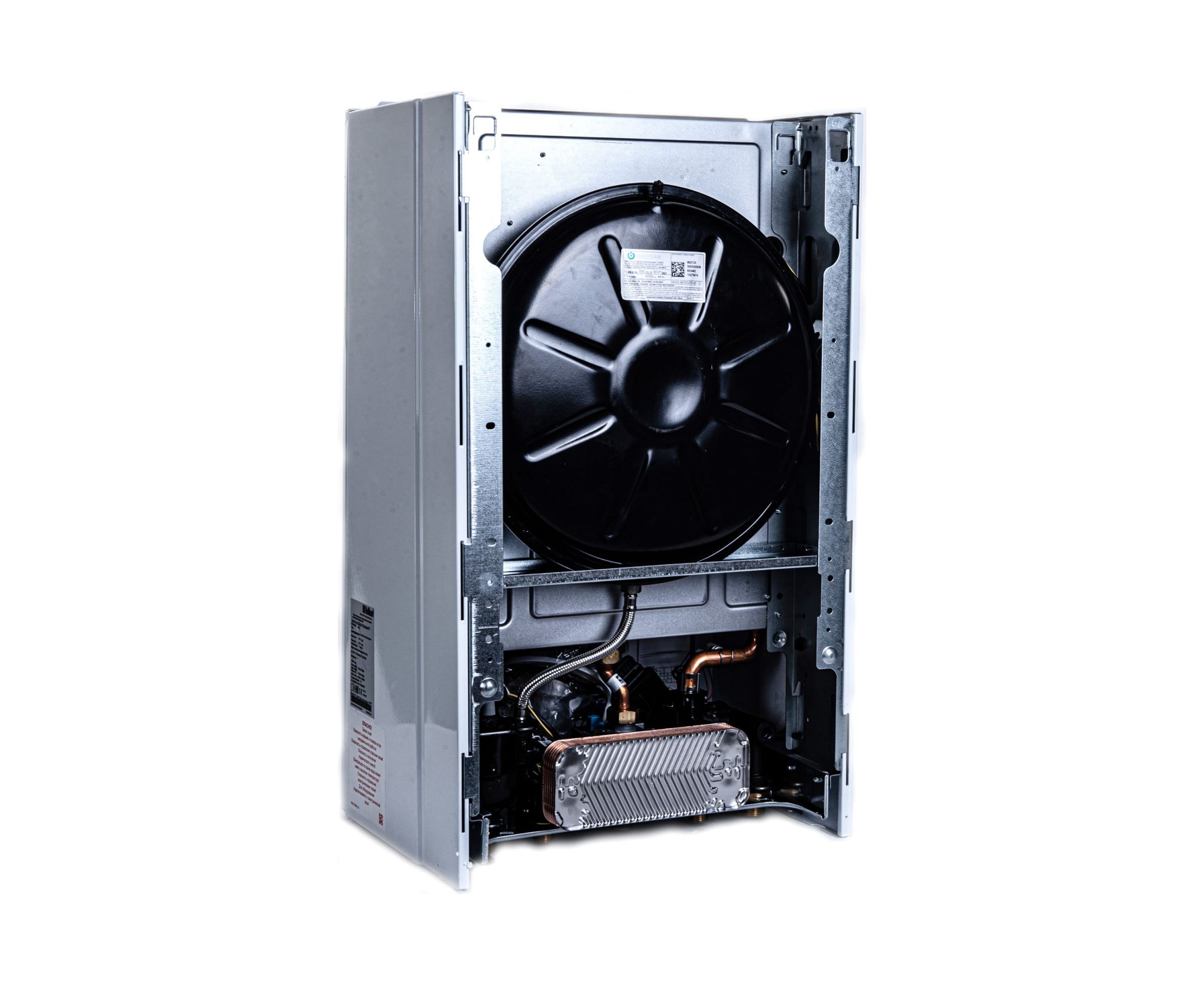 Оснащен закрытой камерой сгорания, что дает возможность установки котла в жилой зоне. Отвод продуктов сгорания производится через сертифицированную систему дымоходов.