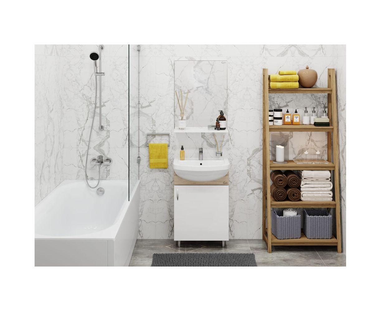 Компактные габариты позволяют грамотно организовать небольшой санузел, а простой белый глянцевый фасад и корпус цвета дуба с роскошной текстурой гармонично впишется в интерьер любой ванной комнаты.