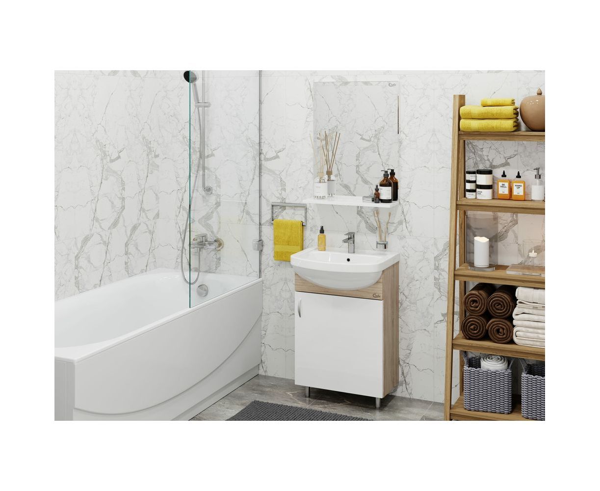 Компактные габариты позволяют грамотно организовать небольшой санузел, а простой белый глянцевый фасад и корпус цвета дуба с роскошной текстурой гармонично впишется в интерьер любой ванной комнаты.