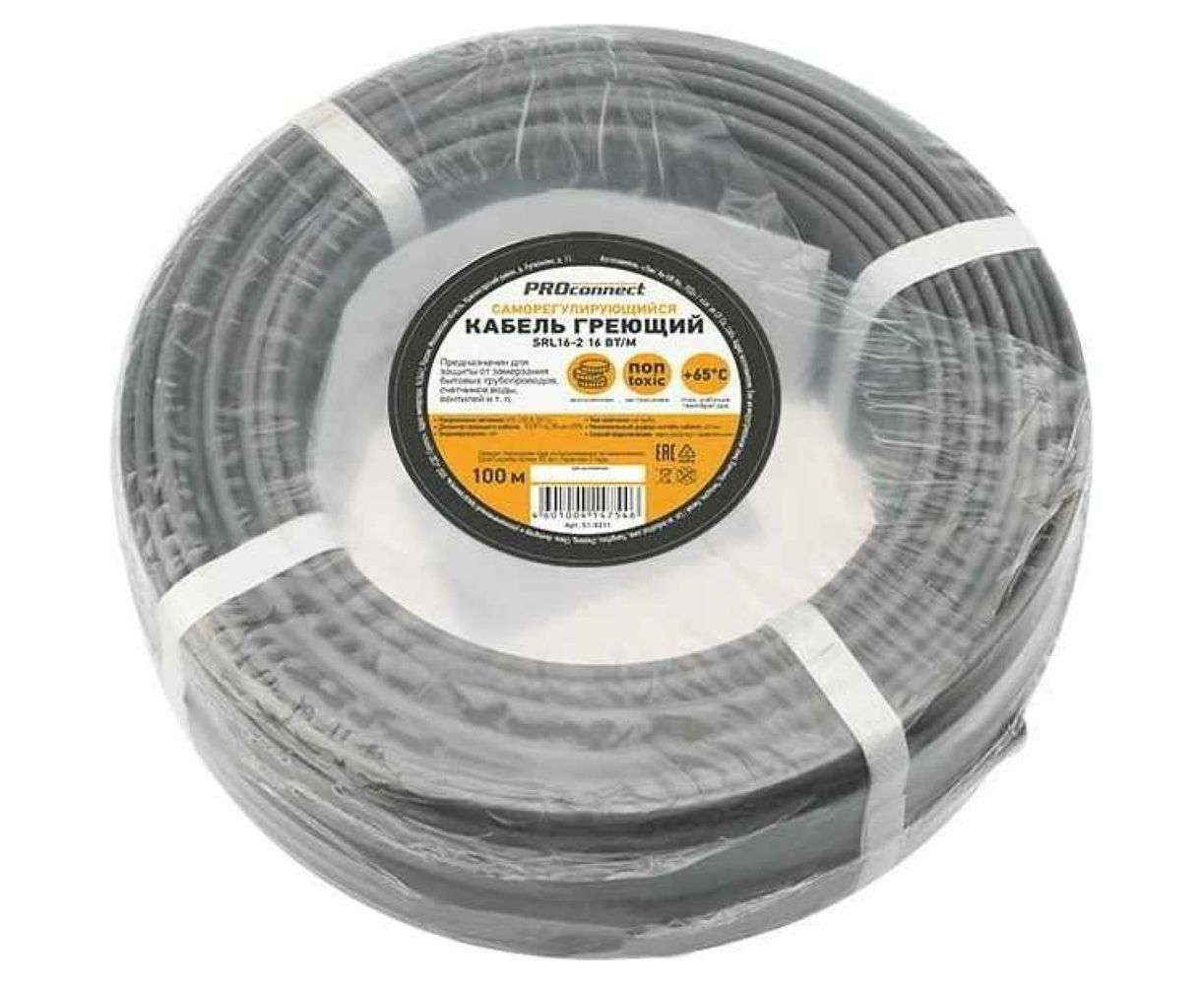 Греющий саморегулирующийся кабель PROCONNECT SRL16-2, неэкранированный, 16 Вт/1 м, 100 м 51-0211 предназначен для защиты от замерзания бытовых трубопроводов диаметром не более 150 мм, счетчиков воды, вентилей и т.п.