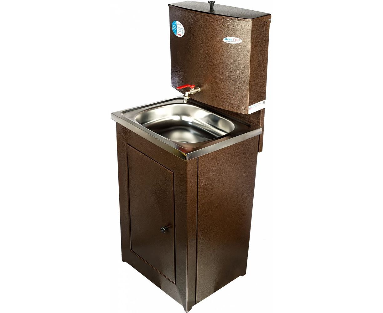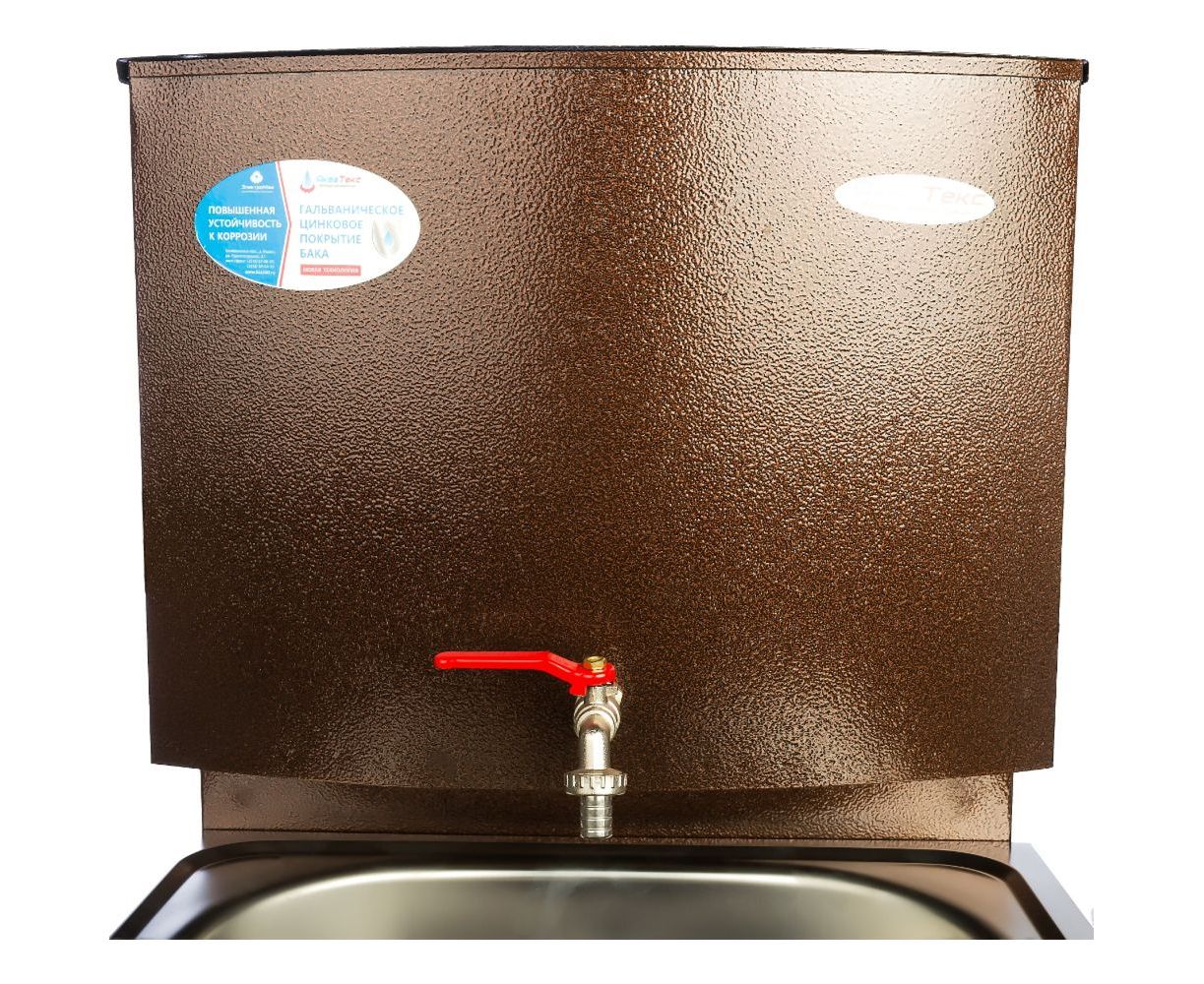 Умывальник дачный выполнен из высококачественной стали 0,7 мм. Конструкция умывальника Акватекс составная: включает в себя тумбу, которая аккуратно скрывает способ слива воды и позволяет осуществлять водоотвод в канализацию или отдельную емкость, и бак с металлическим шаровым краном. Емкость бака внутри обработана гальваническим цинковым покрытием, которое обеспечивает долгий срок службы изделия и исключает появление ржавчины (если не будет мех. повреждений).