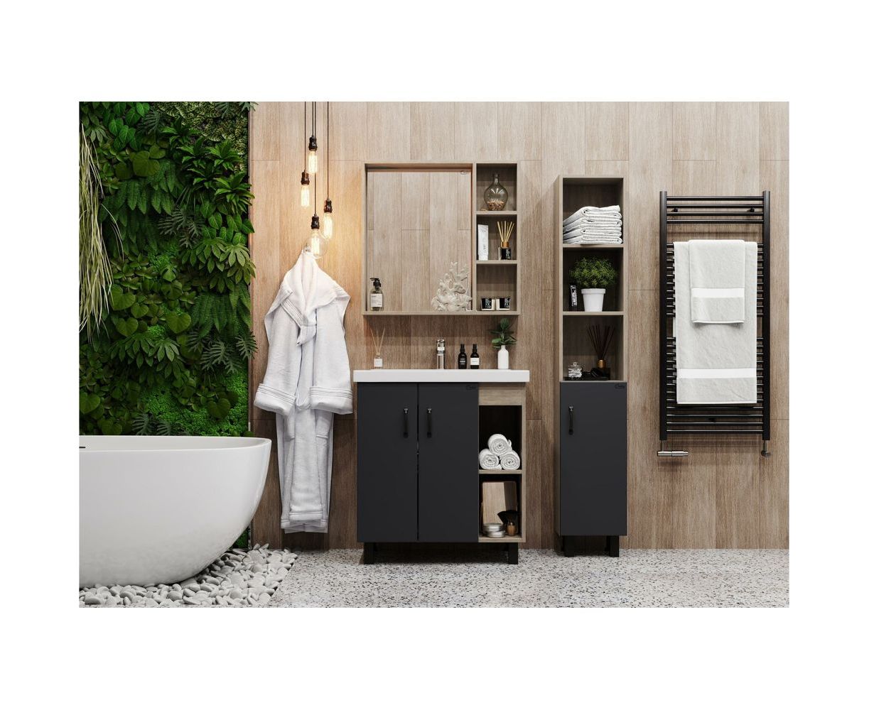 Тумба с раковиной Onika ТИМБЕР 70.10 серый мат./дуб сонома 107057 в которой удачно сочетаются контрастные цвета и фактуры: серый матовый фасад с покрытием SoftTouch, корпус цвета дуба с роскошной текстурой, черная матовая металлическая фурнитура.