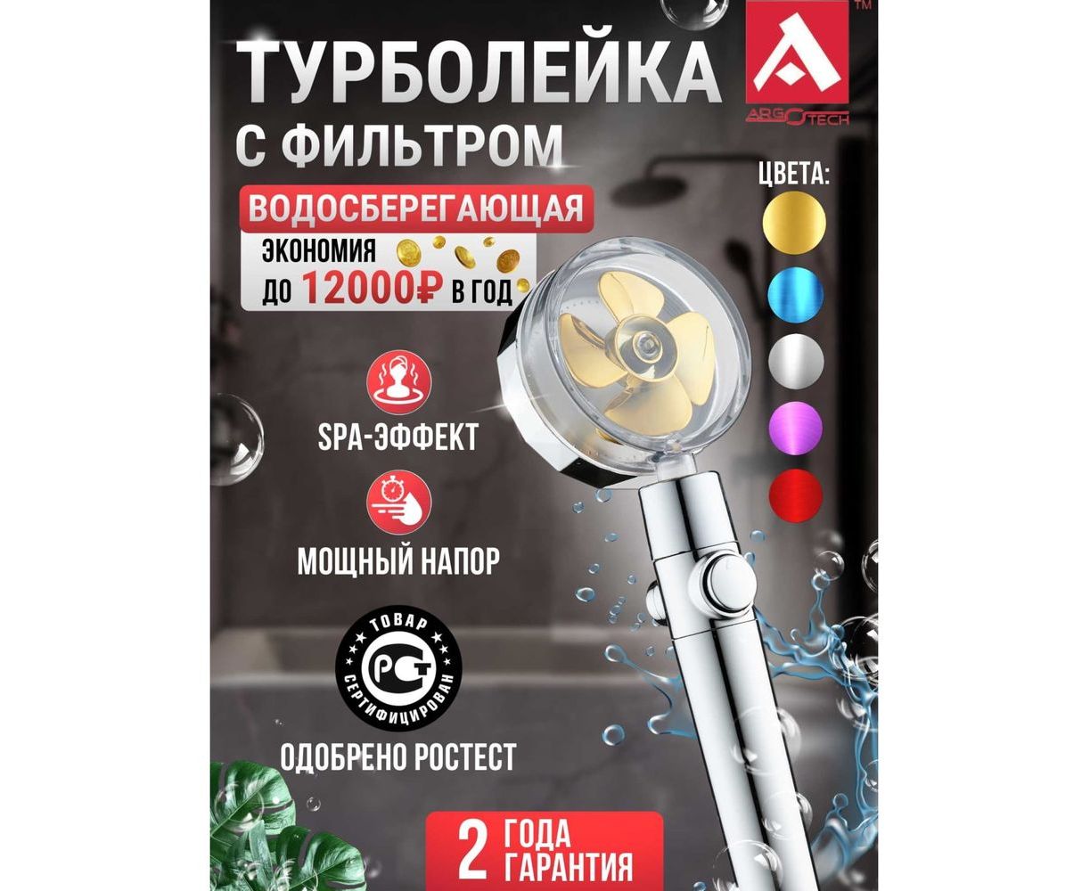 Лейка для душа ARGO с вентилятором подарит незабываемые ощущения как от SPA процедуры. Установленный внутри пропеллер полностью смешивает горячую и холодную воду и под высоким давлением подает ее через душевую сетку из нержавеющей стали с микроперфорацией. За счет этого турболейка делает напор сильнее в два раза и при этом снижает количество расходуемой воды на 50% - 60%, а значит водосберегающая лейка просто незаменима для экономии воды. Проходящая через рассеиватель лейки для душа поток воды, благодаря большому количеству микро отверстий, более 100, создает спа эффект "шелковый дождь". Вращающаяся головка лейки поворачивается на 360? вокруг своей оси и позволяет выставить удобный угол направления воды.