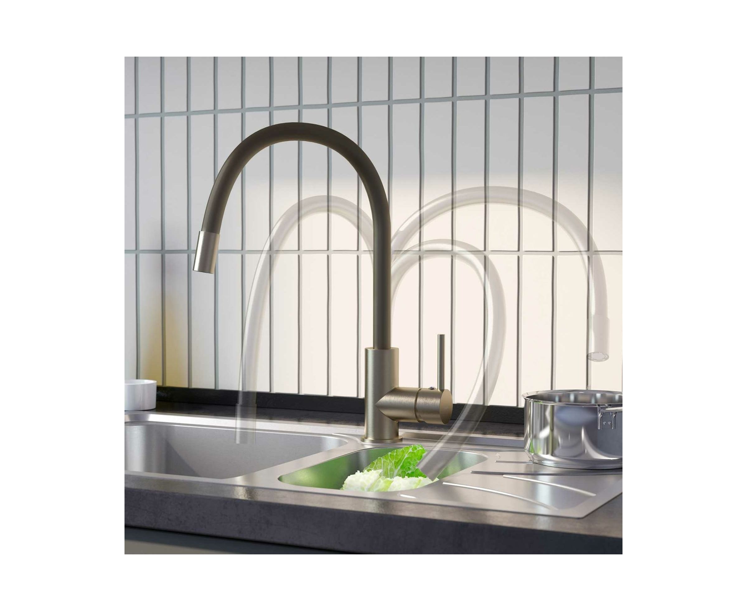 Смеситель для кухни IDDIS Kitchen 360 сатин K36BNJ0i05 с гибким силиконовым изливом в редком для российского рынка сатиновом оттенке. Смеситель Kitchen 360 позволяет выполнять рутинные задачи на новом уровне комфорта: с гибким изливом легко промывать овощи и фрукты, наполнять крупногабаритную посуду, мыть мойку. Внутренний шланг из нержавеющей стали с особой системой соединения звеньев придает изливу гибкость и прочность. Он будет держать свою форму, не деформируясь со временем.