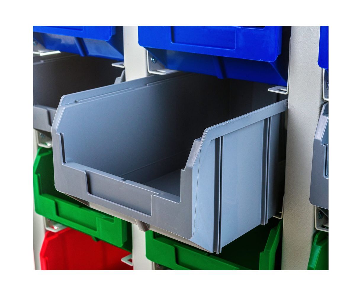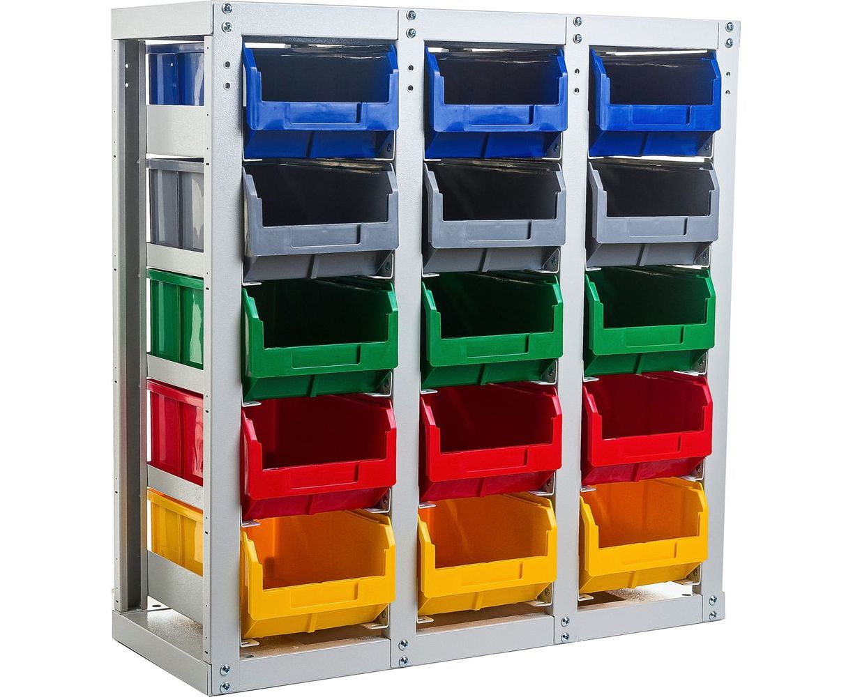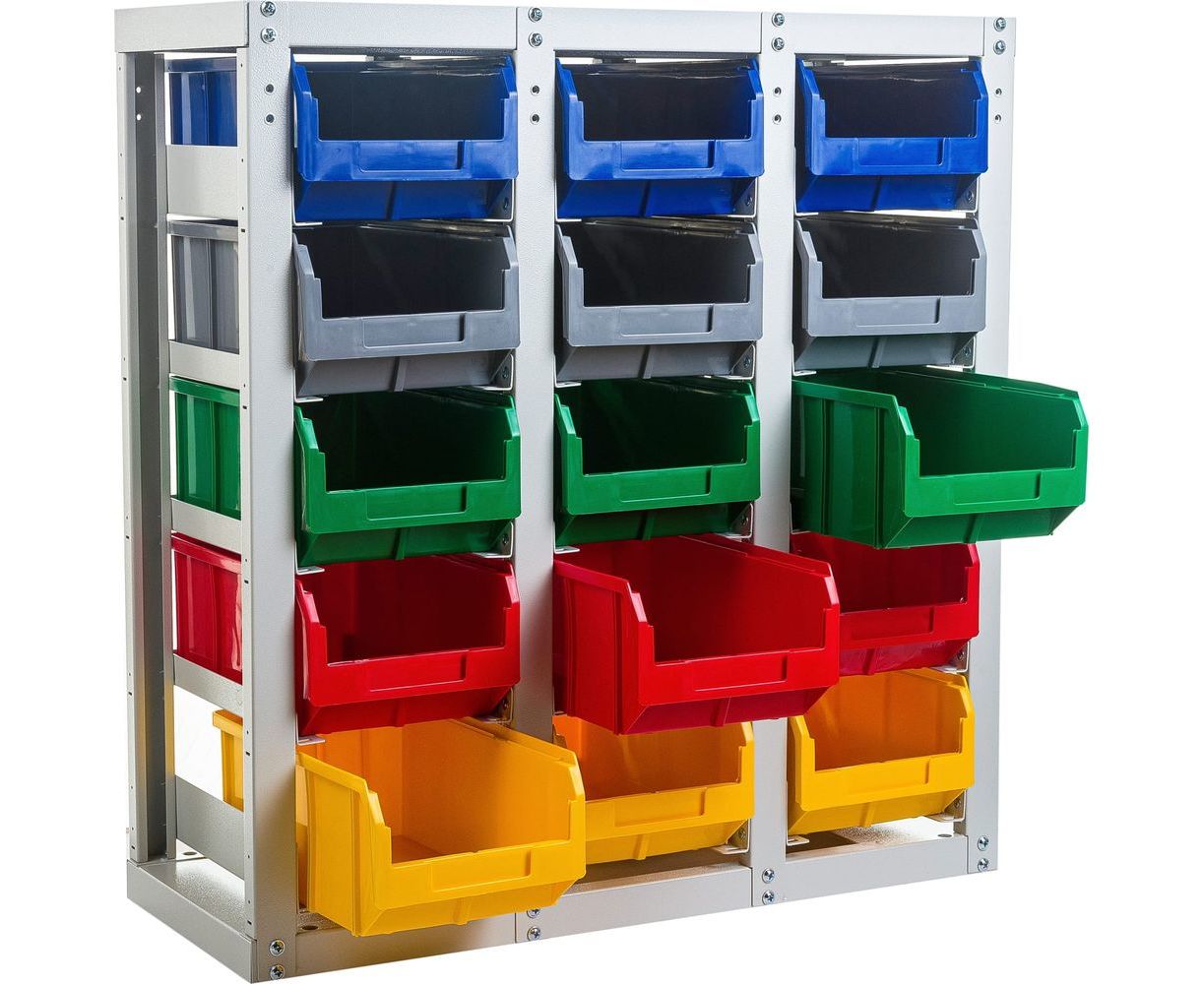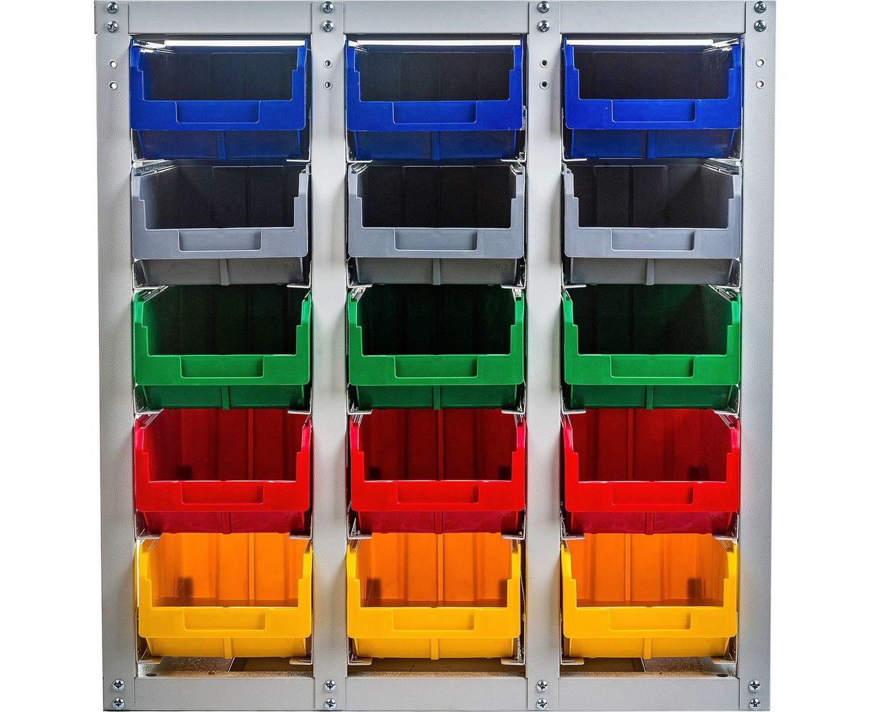 Стеллаж с направляющими Стелла-техник стационарный, односторонний, 15 ячеек с ящиками, V3-15 широко используется для установки в складских и подсобных помещениях, в гаражах, автосервисах и прочих ремонтных мастерских для размещения всех необходимых инструментов, приспособлений, метизов и различных мелочей под рукой мастера. Данная модель позволит легко поддерживать порядок на рабочем месте. Специальная конструкция ячеек обеспечивает хороший обзор хранимого содержимого. ГхШхВ: 320х980х1000 мм, вес: 50 кг.