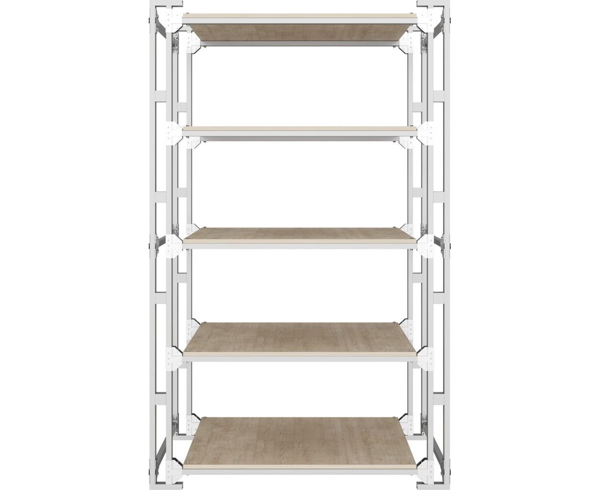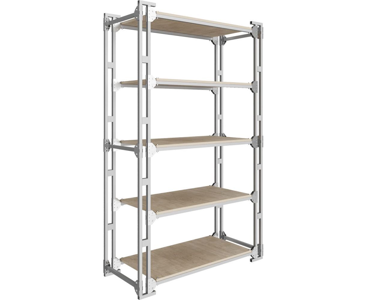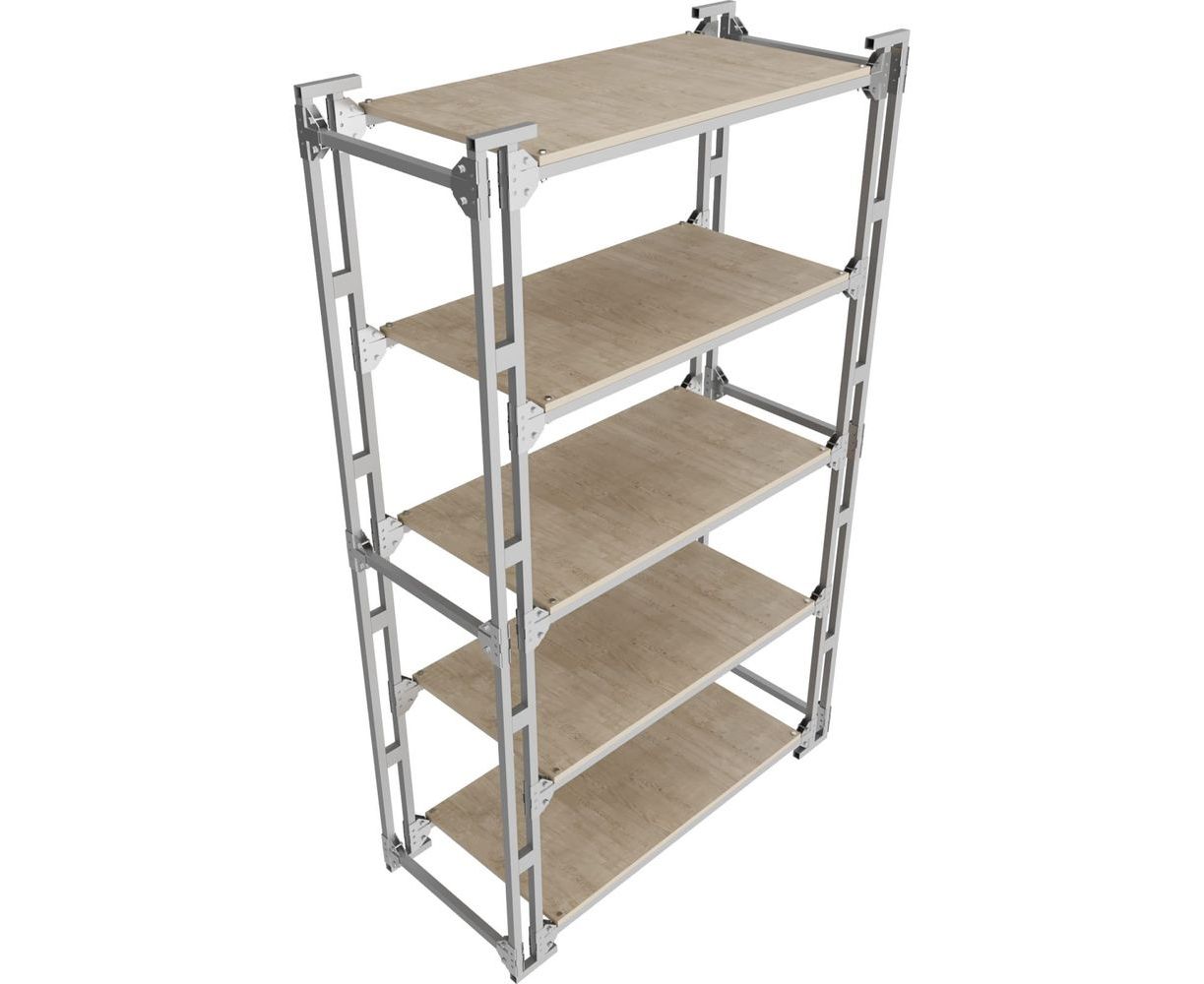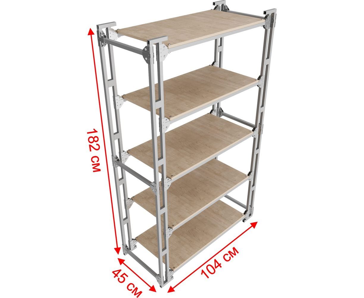 Каркас стеллажа выполнен из двойной профильной трубы 20х20+20х20, покрашен в антикоррозийную эмаль. Стеллаж состоит из восьми разборных стоек, 5 полок выполненных из ДСП и пластиковых подпятников, собирается при помощи крепежа краб-система благодаря которому регулируется высота каждой полки.