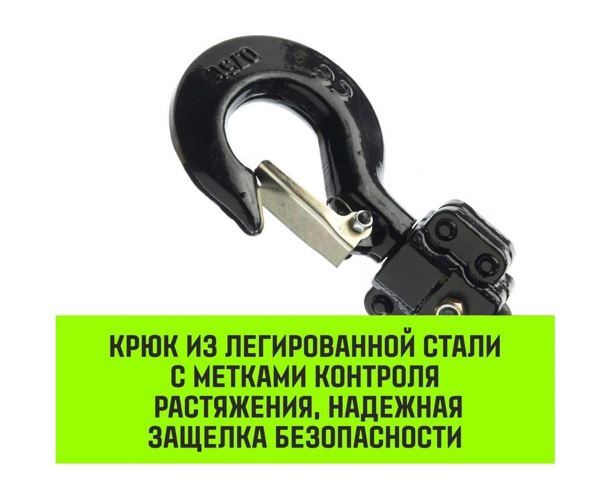Конструкция крюков, изготовленных из легированной стали с метками контроля растяжения позволяет при чрезмерной нагрузке не разрушаться, а постепенно растягиваться, тем самым указывая на перегруз. Надежную работу обеспечивают надежные защелки безопасности закрепленные у основания. Подъемник имеет одну из самых надежных тормозных систем на рынке. Функция защиты в режиме свободного хода: если груз начинает резко падать, тормоз подъемника срабатывает мгновенно.