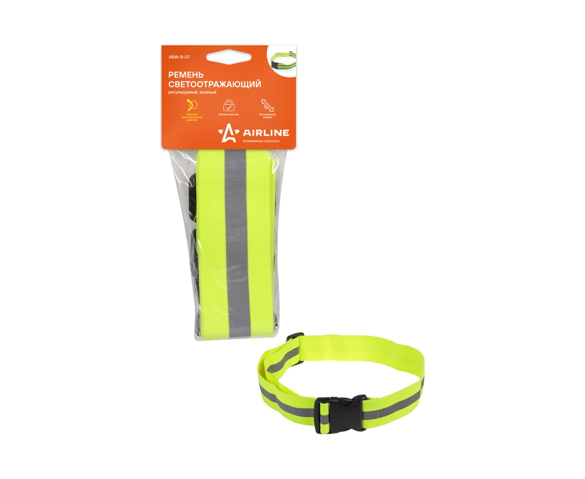 Регулируемый светоотражающий ремень Airline зеленый ARW-B-07 изготовлен из широкой резинки с регулируемой пряжкой-бегунком и застежкой фастексом.