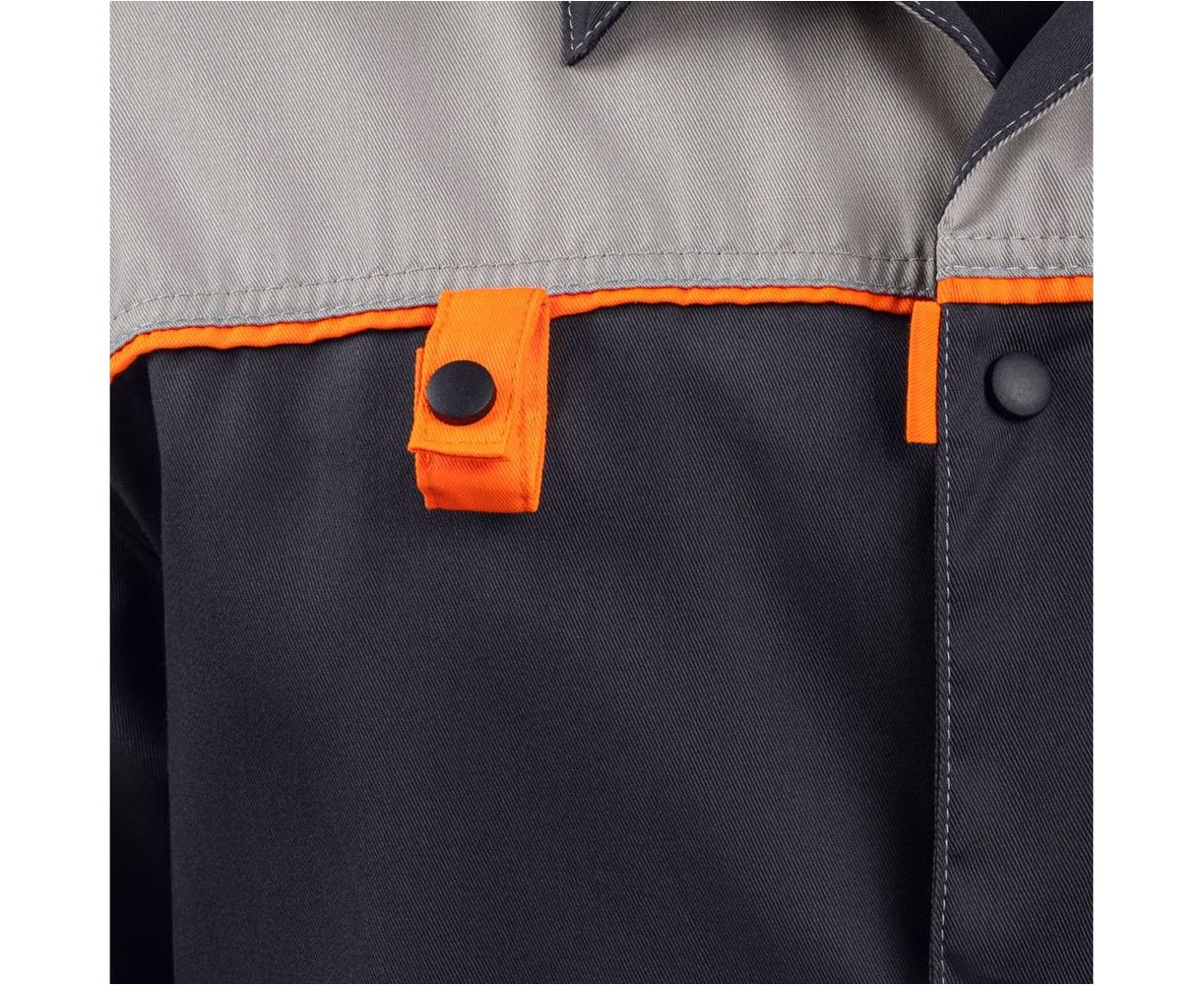 Мужской халат ТЕХНОСЭЙФ ДОН ЭК, темно-серый/серый/оранжевый, р.104-108/182-188 4687203159757 изготовлен из смесовой ткани с водоотталкивающей пропиткой.