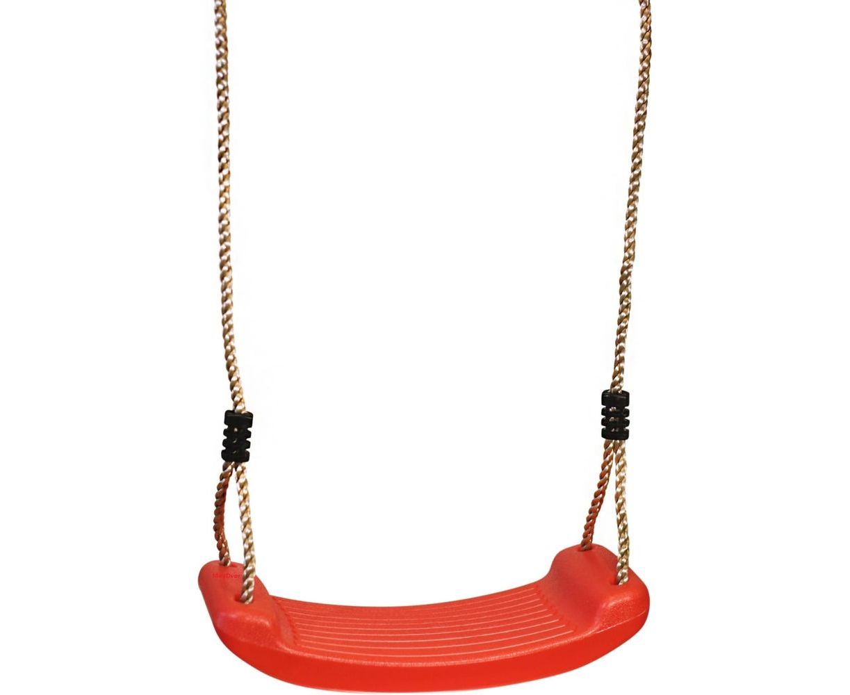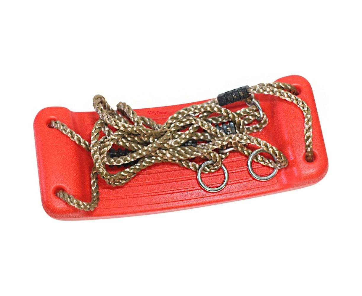 Пластиковые качели красного цвета с изогнутым сиденьем на веревочном подвесе длиной 1700 мм. Размер качелей 430*170*100 мм. (размер места для сидения 310*170мм.).