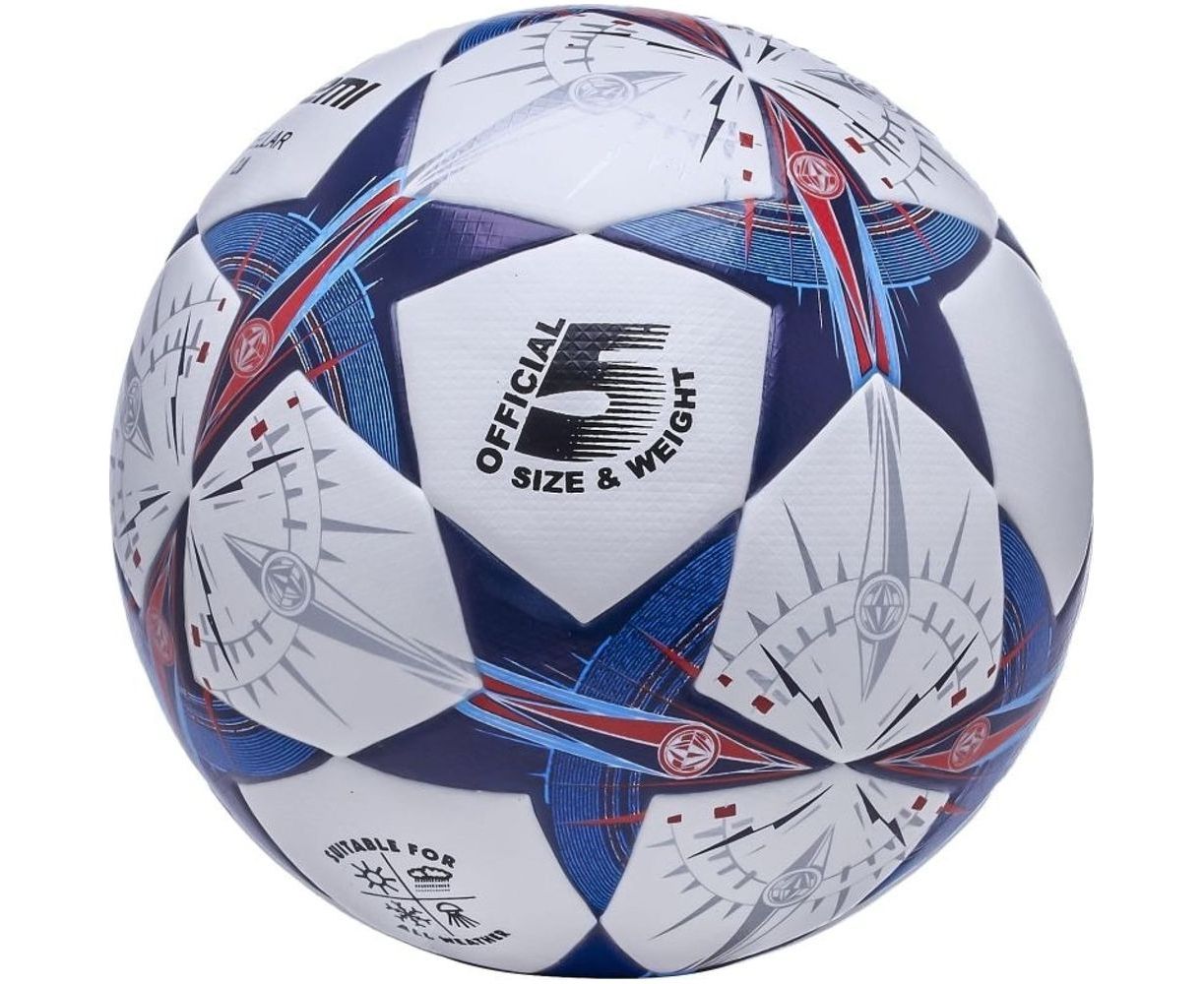 Яркий, бело-сине-оранжевый футбольный мяч подходит для тренировочного уровня игры.