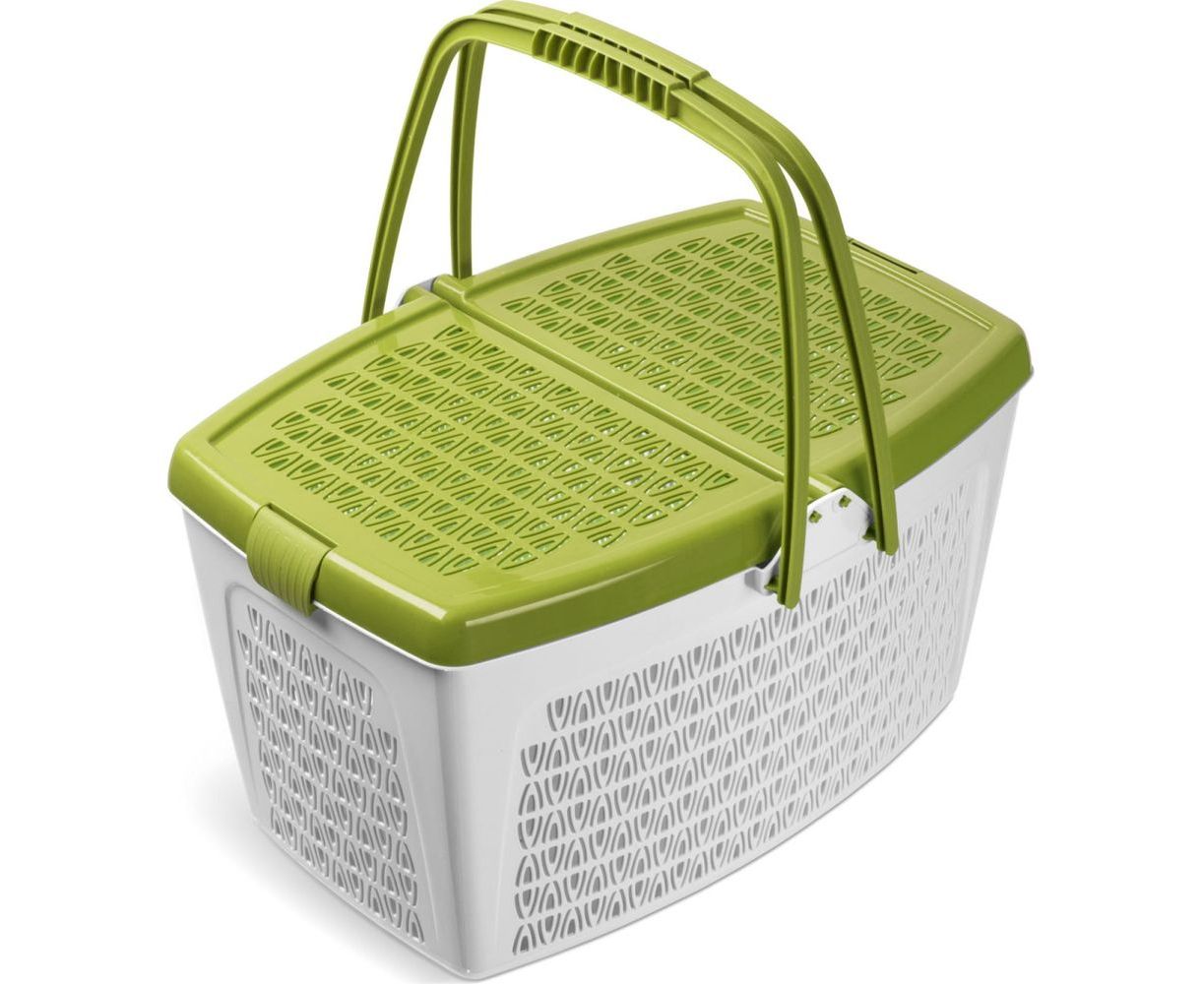Крышка оснащена защелками и отлично подходит для переноски различных вещей и продуктов.