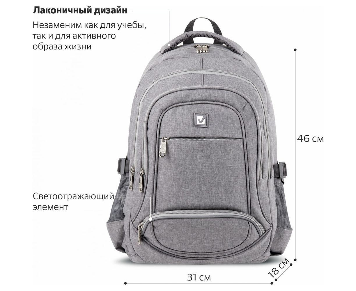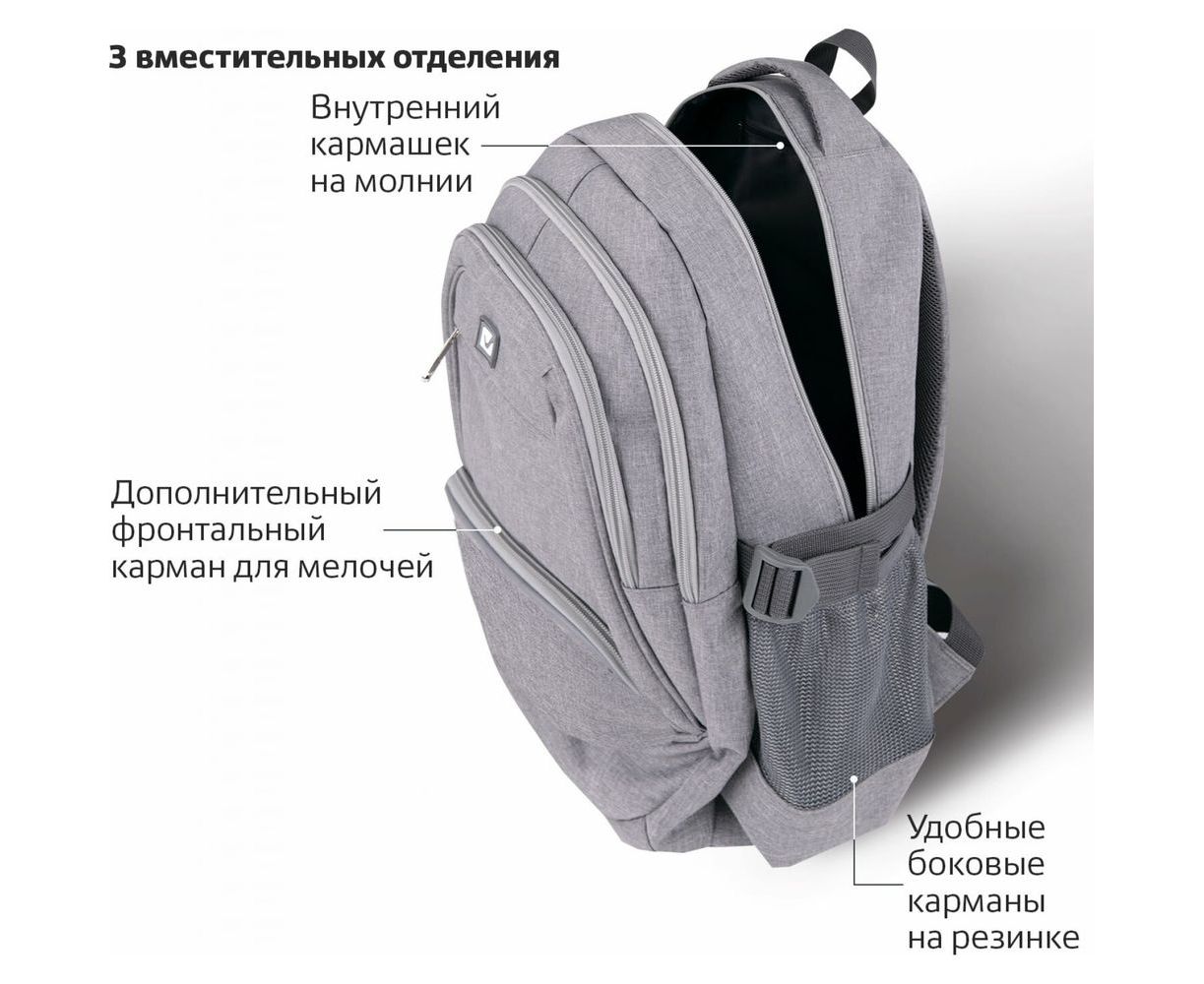 Универсальный рюкзак BRAUBERG 3 отделения, светло-серый, 46x31x18см 270762 подойдет для старшеклассников и студентов.