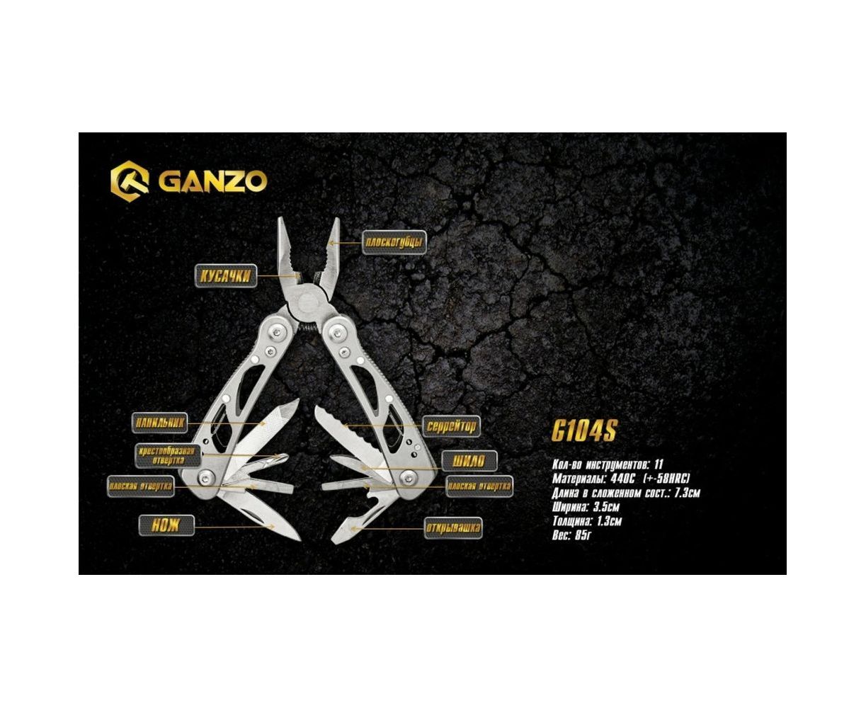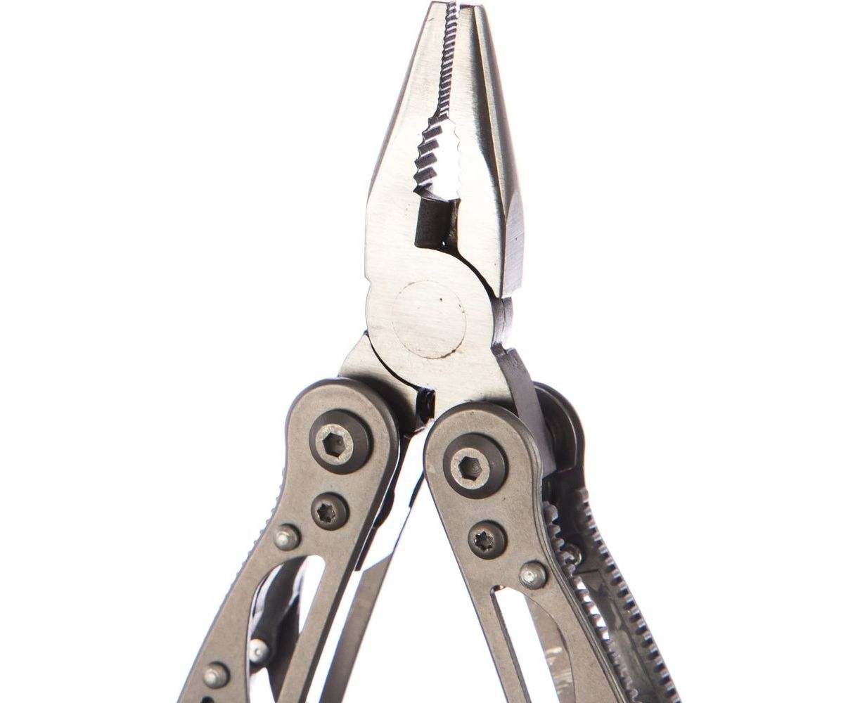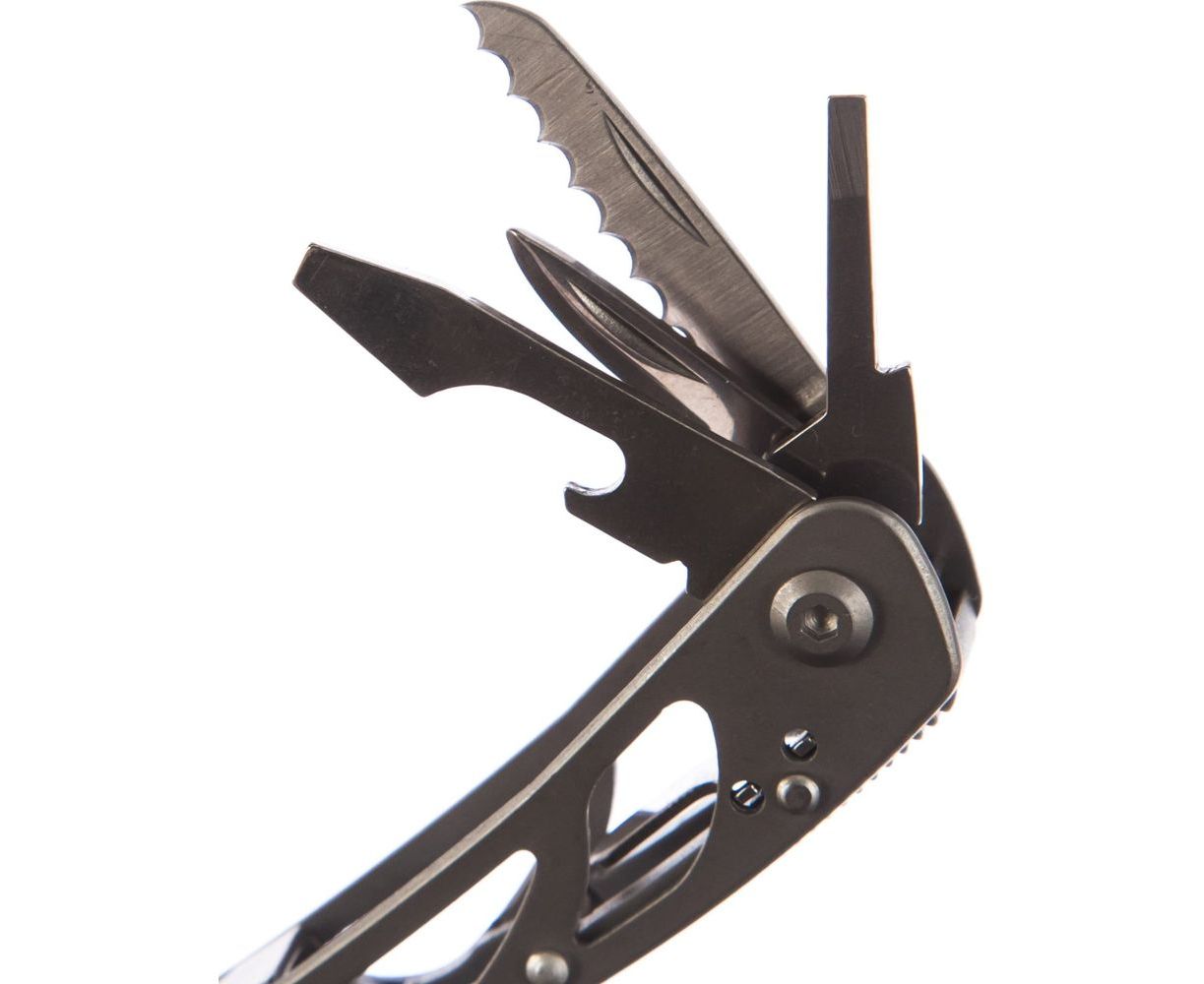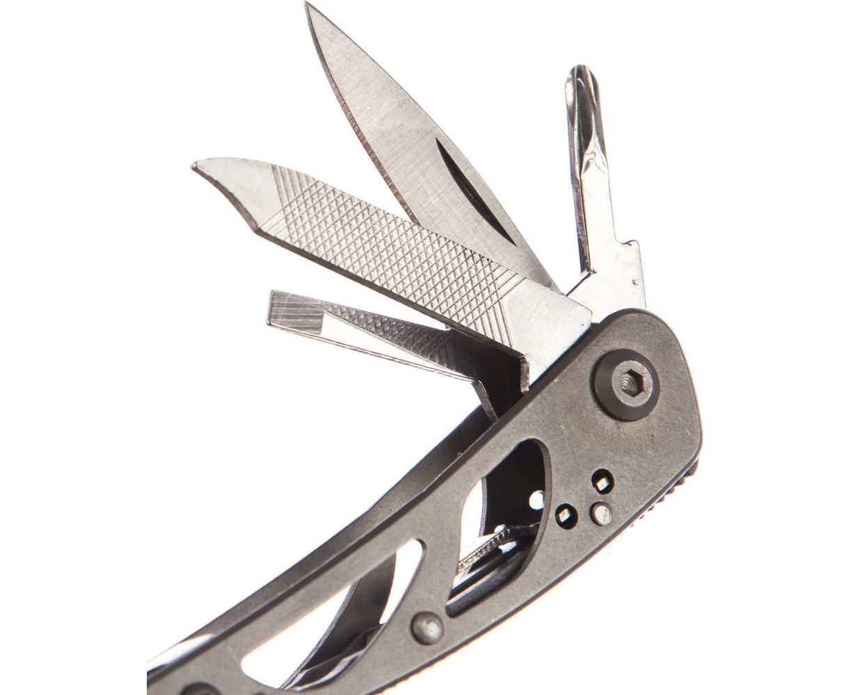 В комплект мультитула G104 S входят следующие инструменты: подпружиненные плоскогубцы с кусачками, два лезвия, одно из которых имеет серрейторную заточку, две плоских и одна крестообразная отвертки среднего размера, шило, небольшой напильник, паз для снятия изоляции с проводов, открывалка для бутылок и консервный нож. Все инструменты выполнены из нержавеющей стали 440С, которая имеет высокие эксплуатационные характеристики.